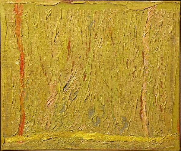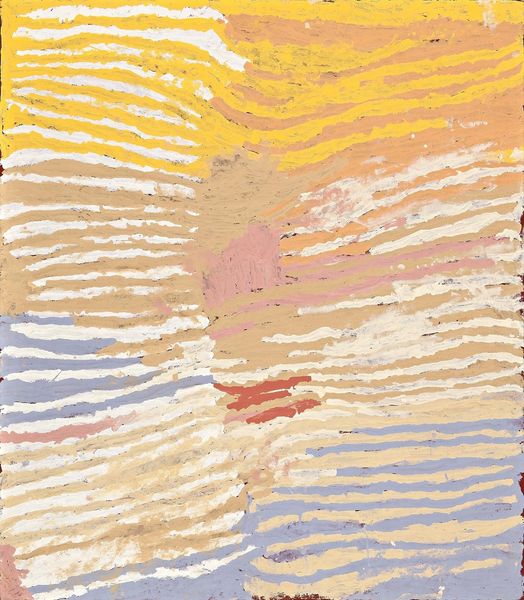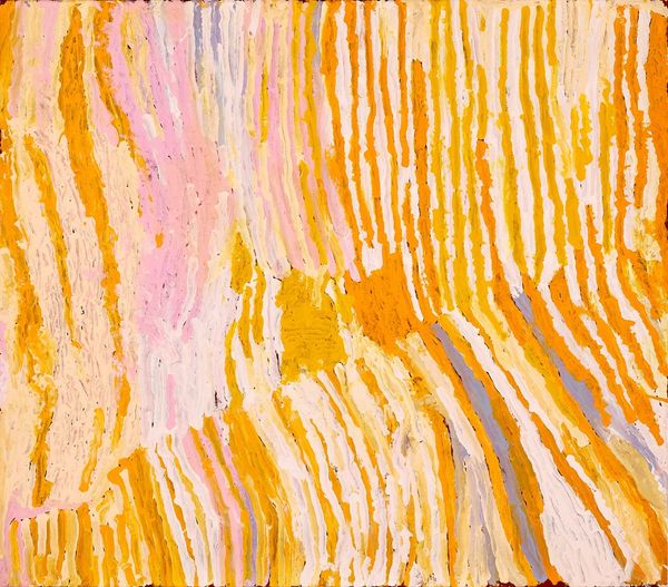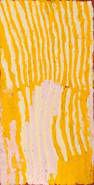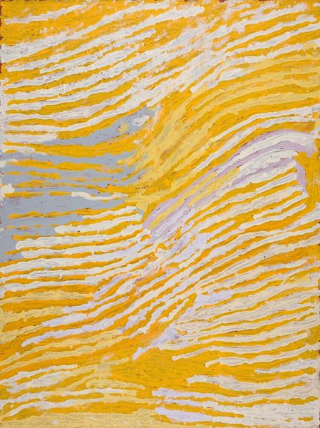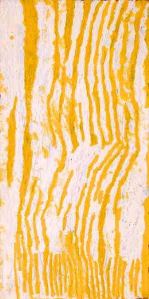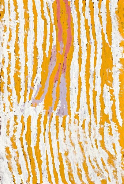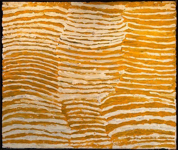 Curator: Okay, standing before us we have a work by Makinti Napanangka, intriguingly titled "Hairstring Dreaming," executed with acrylic paint. Its visual field is dominated by vertical striations of ochre and white. Editor: First thought? Sunshine through wheat fields. There's something hypnotic, almost meditative, about those repeated lines. You could just sink into them, you know? Lose yourself in the pattern. Curator: Indeed. The verticality imposes a very particular structure. If we consider this within the context of abstract expressionism, we might see a play between organic form and rigid composition. The artist uses the line not merely decoratively, but structurally. Editor: Structurally, yes, but also rhythmically. It's like a song, a visual song. Do you think the title, "Hairstring Dreaming," offers a clue? Like, dreaming through the strands of something fine, something connecting us to something else...or some ancestral connection. Curator: Perhaps. Such speculation relies on associating meaning outside of the image itself. However, we can look at the materiality of the acrylic. Its application, thick and textured, gives the lines a three-dimensional quality, almost sculptural. Editor: I think that texture is everything. It begs to be touched, doesn’t it? It makes you want to know how it feels, what thoughts ran through Makinti Napanangka's mind as she made each individual stroke. What a patient piece this is! Curator: We can also consider the interplay between the colors. The ochre, dominant, offers a grounding presence, while the white creates contrast and emphasizes the rhythmic quality of the lines. Semiotically, white space represents silence. It adds complexity by evoking these non-visual elements to this visual presentation. Editor: I suppose! But for me the overall effect is pure joy. It feels alive! Even with all the linear elements, there's movement and vitality... almost like the painting itself is breathing, sighing gently... Maybe the hair-strings have voices, whisper dreams... Curator: Ultimately, "Hairstring Dreaming" functions as an abstract piece relying heavily on color, structure and materiality rather than easily read content. It creates an immersive sensory experience that invites contemplation. Editor: Absolutely. I walk away from this just a little more awake to the pulse of everything. It really calls something new forth to dance out in the world.