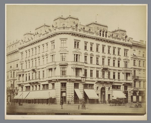Curator: This evocative photograph is titled "Franz-Josef-Quai No. 13, Zinshaus des Herrn Grafen Anton von Pergen." It's an anonymous daguerreotype, most likely taken in the 1860s, and depicts a building on the Franz-Josef-Quai in Vienna. Editor: It's strikingly… austere. The rigid geometry of the building, all those regimented windows. And the limited tonal range contributes to this overall feeling of restraint, almost oppressiveness. Curator: I see the formality, but there’s a certain elegance as well. The repetition of windows creates a sense of order, mirroring the values of the Austro-Hungarian Empire. And the very act of photographing architecture demonstrates a belief in its enduring importance as a cultural symbol. It embodies Vienna's status, then and now. Editor: Hmm. I suppose the horizontal division into distinct layers offers some relief from pure repetition. The awnings create strong horizontal bands that interrupt the vertical thrust. Plus the signage provides some semiotic anchor points to a world outside architectural formalism. Curator: The signs give it life. “Cafe Seifert,” “Schol & Bachrach” - it’s not just about architectural forms. These clues give a narrative, indicating thriving businesses within those stone walls. They reflect social class and daily routines. I sense a tension between permanence, represented by the building, and the transient nature of commerce and street life. Editor: Yes, and the slightly soft focus—likely an artifact of early photographic technology— ironically lends a certain dreamlike quality to this otherwise stark scene. A hint of atmospheric haze softens the sharp angles of the building. Curator: That haziness does invite you to imagine all those lives playing out behind the windows. People with their own unique narratives who were somehow linked to this physical place. That photograph becomes a cultural artifact preserving not just an image of Vienna, but also an image of time itself. Editor: Agreed. Looking at it closely, beyond the initial impression of severity, there’s a lot to see here regarding structure, light, and that captivatingly antiquated style. Curator: A small portal opens to another era. A very potent reminder of how symbols carry complex social, economic, and political memories.