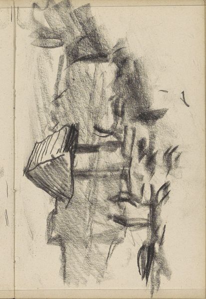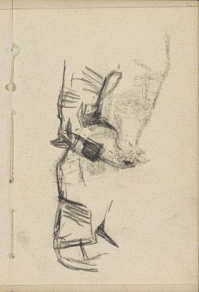 Curator: Looking at this artwork, a graphite drawing titled "Paardenhoofd met oogkleppen"—"Horse's Head with Blinders"—created around 1909 by George Hendrik Breitner, which now resides in the Rijksmuseum… the most immediate thing that strikes me is how raw and fleeting the image feels. Editor: Fleeting, yes! It's almost as if the artist caught a glimpse of the horse and quickly sketched it before the moment was gone. I love how the sketchiness conveys this ephemeral quality. Curator: Precisely. The sketch reminds me how artists used these animal symbols across cultures; horses often represent strength, freedom, or even a kind of untamed wildness. But here, with the inclusion of blinders, we get something different. There’s a tension introduced, between power and constraint. The eye covering changes everything. Editor: Absolutely! The blinders shift the symbolic reading; they evoke a sense of control. Think of it—reducing the horse's vision seems a bit cruel. Perhaps it reflects societal constraints back in that era. The horse, once wild and free, becomes harnessed and directed. There is a loss of innate capability. Curator: Interesting. Horses with blinders appear throughout art history – not just as representations of labor or transport, but also in military contexts. I wonder if Breitner was interested in alluding to broader themes of militarization or the industrial complex, or something uniquely personal. It almost forces us to reflect on the subjugation involved. Editor: That feels like a valid perspective. For me, the simplicity is affecting. The stark black lines create a potent image; it invites empathy and encourages you to reflect on hidden possibilities. It’s the stark quality in how the eye coverings, which symbolize a denial of vision and freedom, invite our deeper emotional investigation. Curator: And in this sense, such pieces demonstrate that, through rendering animals and everyday elements of our existence with a distinctive symbolic charge, our perspective as a people is remembered for the many years which come. Editor: A moment of visual reckoning and an inquiry on imposed structures all rendered on a paper’s delicate surface. What a journey this has been!