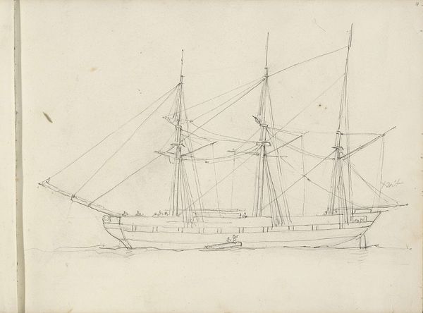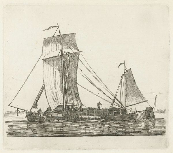 Curator: Editor: This is "Tweemaster met figuren," a print made in 1789 by Gerrit Groenewegen, using etching and engraving techniques. The detail in the rendering of the ship itself is incredible. How do you interpret this work? Curator: For me, it’s impossible to look at this without thinking about labor. An etching like this isn't just a picture; it's a commodity, a product of a skilled artisan—Groenewegen—who had to translate his vision through the painstaking labor of engraving and etching. How might the labor involved in its creation shaped its reception at the time? Editor: That's an interesting way to look at it. I guess I was so focused on the artistry of the image that I overlooked the amount of work involved in creating this kind of image back then, especially compared to our modern methods of capturing images of ships at sea. Curator: Precisely. And it’s not just the labor of the artist but the labor implied in the subject. What kind of economy does this ship support, who profits, and whose backs are breaking in the process? Consider, too, the materiality. Printmaking made images like these accessible. Who could afford this, and what stories about the world and trade does its consumption tell? Editor: I hadn't considered it as something accessible to a broader public at the time. You're right, thinking about it in terms of the social and economic contexts, how this was made and who it was for, really opens it up. Curator: Yes, it highlights that art doesn't exist in a vacuum; its materials, processes, and consumption all tie into broader social structures. And these considerations are not separate from but rather intrinsic to aesthetic experiences and what something represents. Editor: I'm leaving this conversation with a renewed interest in considering art’s place in commerce. Thanks so much. Curator: And I with a desire to dig deeper into the lives and hands behind this print.