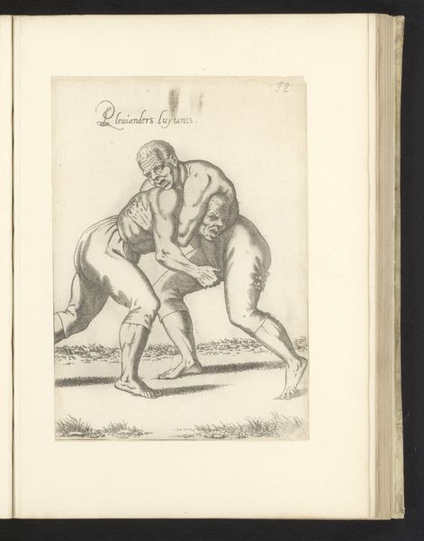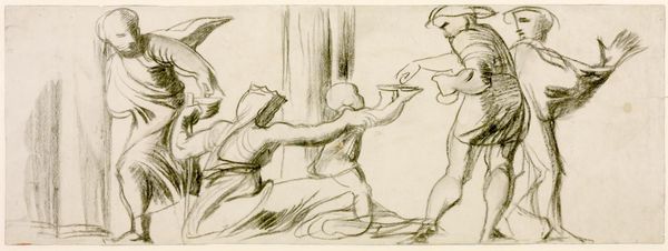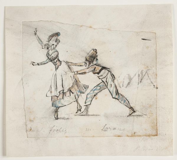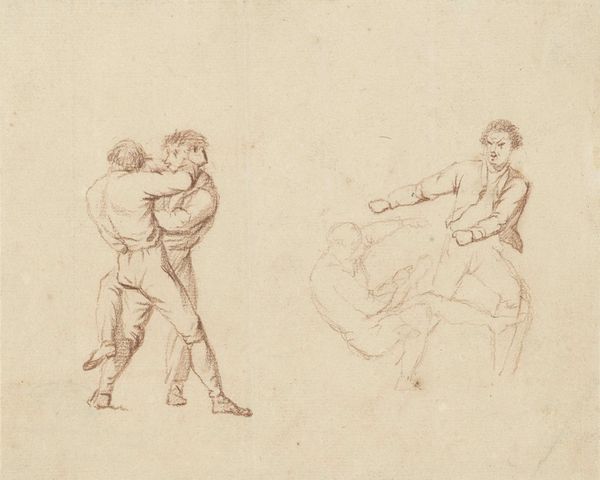 Curator: Looking at this piece, the first thing that strikes me is the tentative quality of the line work; there is a certain uncertainty about it, like something captured in a fleeting moment. Editor: Indeed. This is "Illustration til "Katekismus for alle mennesker"" by Johann Gottlieb Friedrich, created between 1742 and 1809. It is currently held at the SMK, Statens Museum for Kunst. Made using pen and ink, this print on toned paper provides us with an insightful glance into the artist's sketchbook. What does the image evoke in you from a socio-political point of view? Curator: Initially, the embrace between these two figures appears almost tender, though strained. Looking deeper, in a time marked by evolving social doctrines, could this portrayal represent power dynamics between the privileged and the marginalized as seen through theological tenets? Are we observing a physical manifestation of societal wrestling depicted via light pencil work, highlighting the inequalities inherent in 18th-century life? Editor: From my perspective, what truly captivates is how Friedrich employed line to articulate form. Observe the parallel hatching defining their garments and limbs. This structured technique lends weight and volume to the figures. The sketch-like quality creates dynamism, accentuating the struggle, perhaps even the intimate connection, between the two figures depicted. Curator: This structured, semiotic analysis is helpful. Thinking further, it’s interesting to see how physicality intersects with prevailing religious discourses. Consider that catechisms were traditionally used to reinforce hierarchical structures by instructing the masses. Might this struggle symbolize resistance against imposed ideologies? Editor: It's this constant juxtaposition that enhances the work, right? The composition directs our eyes towards the tense junction of their bodies; a site, a nexus of power, as you pointed out. What initially appears spontaneous turns into a highly organized structure under closer inspection. Curator: Precisely. And by recognizing these tensions within the artist's work, it gives us the tools to reflect critically on contemporary iterations of these conflicts. Editor: By examining both the formal techniques and contextual influences, one can grasp not only the piece's artistic merit, but its societal narrative and reverberations through the ages. Curator: Absolutely. The visual dialogue between artistic expression and socio-political realities is what gives "Illustration til \"Katekismus for alle mennesker\"" its continuing resonance.