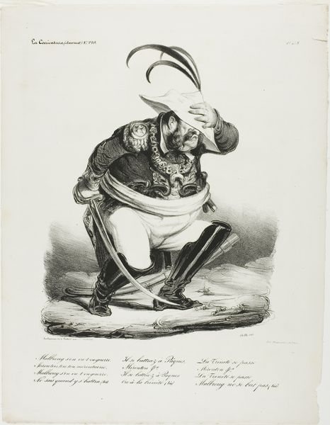 Curator: This print, created circa 1830 by A. Champion, offers a scathing visual commentary—it's titled, "Spotprent op de nalatigheid van de Brusselse autoriteiten bij het begin van de ongeregeldheden, 1830"—quite a mouthful. I believe it’s a lithograph, an etching, judging from the fine lines. What leaps out at you? Editor: Well, the overwhelming feeling is awkwardness. He's standing there so stiffly, kind of shrugging, like, "Oops, did I let a revolution happen?" The poor guy looks incredibly out of place, doesn’t he? Almost theatrical. Curator: The artist uses caricature brilliantly here. Observe how the figure, presumably representing the Brussels authorities, is depicted. The slightly disheveled hair, the nonchalant pose with the rifle—it’s all calculated to convey negligence and indifference. The stack of wood, the papers blowing by. Note how those romantic ideals become deflated by his posture, by this simple line that separates the man from an engagement with those ideals. Editor: And those papers! They look like ignored memos piling up in the background while… well, everything's going to hell! It makes me think of someone whistling innocently while a building burns down next door. The details, too—that crumpled hat on the ground! Curator: Precisely. The hat symbolizes abandoned responsibility. Consider how effective printmaking was for quickly disseminating political satire. Its visual language allowed Champion to immediately critique authority, to hold those in charge responsible for their inaction. It's a stark warning in a very digestible form. Editor: What's chilling, I think, is how relevant it still feels today. It seems like the eternal dance of those in power being totally disconnected from what’s happening on the ground. Looking at him you want to take him to one side and teach him empathy; it's quite effective! Curator: Champion created a clever artwork, that is relevant to this very day. A simple snapshot illustrating how quickly authority loses its way in turmoil, captured with sharp wit and sharper lines. Editor: A portrait of a time, where all times collide.