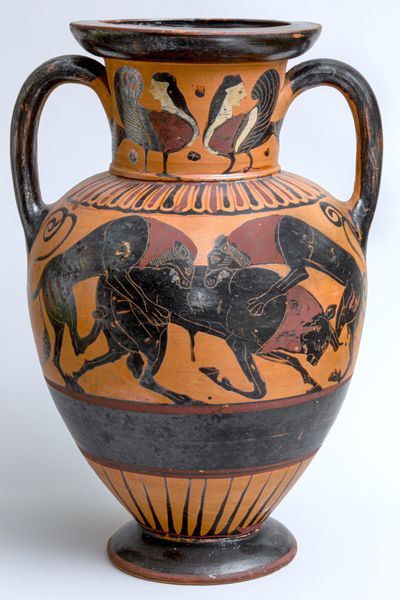 Editor: Here we have a terracotta amphora, a jar, made around 520 BC, and currently residing at the Met. What strikes me is how the narrative unfolds in such a band, contrasting against the black background. What are your initial thoughts on this piece? Curator: It's fascinating to consider how these amphorae functioned as not just utilitarian objects but also powerful vehicles for social and political narratives. Think about it: this vase would have been circulating in a specific community. What stories about Athenian identity might it have been telling? Editor: So, you are saying this isn't just decoration? Curator: Exactly. Consider the figures: warriors, perhaps an elite citizen on horseback, even a dog. These are potent symbols of Athenian power and social hierarchy. Who was commissioning these vases, and what messages were they hoping to project? What would that signify for trade and social status? Editor: I never considered the patron’s intent! Now I'm wondering if the black-figure technique itself—the silhouette-like figures—conveys a certain idea or projects a sense of power, something more simplified and universally readable, almost like propaganda. Curator: A compelling idea! Black-figure does simplify form, making the narrative instantly accessible. Mass production played a key role too. These images saturated Athenian life, normalizing certain ideals and excluding others. Do you notice any exclusion taking place within the selected subjects on the jar? Editor: Hmm, good point. It seems focused on the upper class. So this amphora isn’t just a pretty object; it’s a historical document reflecting and reinforcing the values of its time. Curator: Precisely! And analyzing these values lets us learn about that era. Editor: I see it completely differently now, from decoration to social commentary. Thanks for your insight!