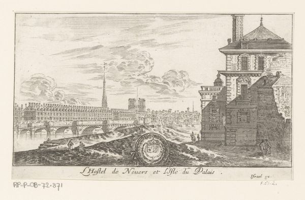 Editor: This is "Graanmolen bij een overtoom," or "Grain Mill by an Overtoom," an engraving created in 1683 by Caspar van Wittel. I find the level of detail in such a small-scale print impressive. What do you see in this piece, especially given its medium? Curator: Immediately, I'm drawn to the printmaking process itself. Van Wittel meticulously translates the landscape, the mill, the very structures of labor into a network of lines. This elevates printmaking, typically viewed as reproductive labor, to an independent and significant form. Editor: I see the connection, but does that shift our understanding of the subject itself – the grain mill? Curator: Absolutely. The mill becomes more than just a site of grain production. It’s an object whose materiality—the wood, the gears—is meticulously rendered and becomes entwined with the labor of the engraver. He’s depicting a site of industry but also engaging in one, right? Consider the social context. Prints like these circulated widely, making the representation of labour and industry accessible to a growing merchant class. Did they buy prints of mills as some kind of capitalist appreciation? Editor: That’s fascinating to consider. So the print itself participates in the economic landscape it depicts, rather than just representing it. Curator: Precisely. It’s both image and commodity, reflecting and reinforcing the era's material culture. Does noticing that alter how you read other details of the piece? The arrangement of water, boat, architecture - the infrastructure that this society needed for industry. Editor: I think it does. Now I'm seeing the grain mill not just as a building, but as part of a complex system of production, all meticulously documented through a laborious printing process. Curator: And by seeing the links between process, object, and the social context, we understand more of its history. Editor: I never would have thought to analyze an image like that. Thanks!