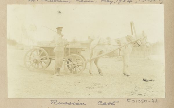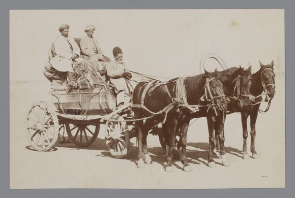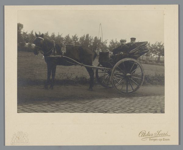 This is an anonymous photograph, “Portret van een onbekende man op een paardenkoets,” by Panajou. Looking at it, it feels so muted, a bit like looking at an old memory. Everything is toned down, a limited range of sepia, which means it isn't really about colour. It’s all about tone and value, and how those tones create shape and form. The photograph feels like a drawing: the quality of line is amazing. The edges of the horse and carriage fade into the background, and the whole thing has a soft, hazy quality. The details are soft and blurred. Look at the way the lines of the carriage wheels, or the harness are described. They are very specific and sharp. It's so detailed, which makes me think about realism versus abstraction, because it's both at the same time. This picture reminds me of Gerhard Richter’s blurred photos, or maybe even a Corot landscape. Like those, it is more about feeling and memory than representation.