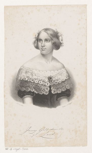 Lodewijk Anthony Vintcent made this portrait of an unknown woman at an unknown date. During the 19th century, portraits were a mark of status. Often commissioned by the wealthy, they reflect a desire to solidify one’s position in society. This work, however, leaves us with a sense of mystery; the woman's identity is unknown, and the artist died young at the age of 29. The woman’s gaze is direct, yet gentle. Her fashion – the flower in her hair, the shawl draped over her shoulders – speaks to the conventions of feminine beauty. But what does it mean to capture a likeness without a name? Does the absence of identity democratize the image, or does it erase the individual’s history? Consider how our reading of the portrait shifts with this ambiguity. This lithograph invites us to consider the untold stories of women in the 19th century, and how their representation in art both reflects and shapes our understanding of their lives.