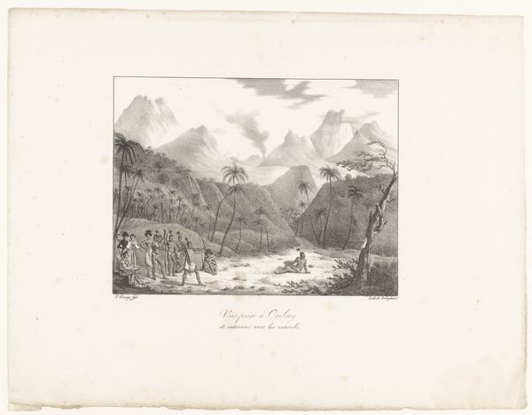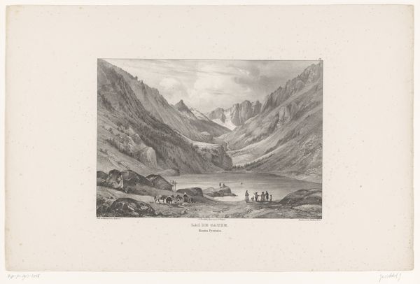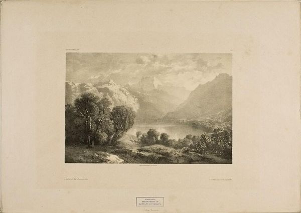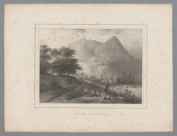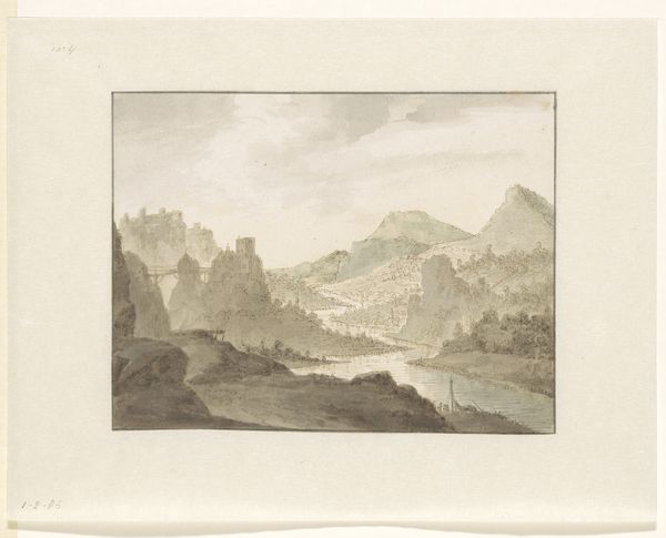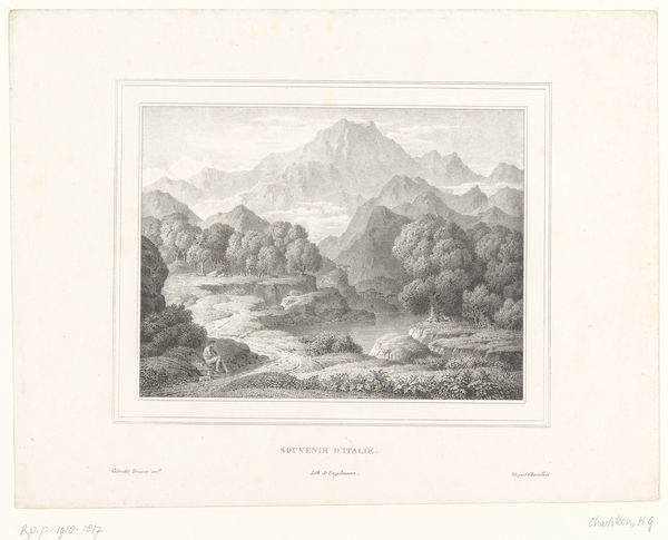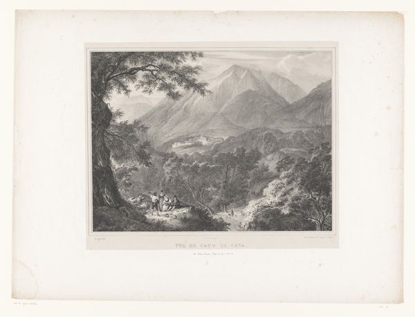 Barend Cornelis Koekkoek made this print, "Gezicht op het Ahrdal," with etching around the 19th century. The print shows a broad view of the Ahr valley in Germany. During Koekkoek's time, landscape art served a crucial function. It reflected a growing national identity, particularly in countries like the Netherlands and Germany, which were consolidating their sense of self. The romantic depiction of the landscape wasn't just about pretty scenery; it was about claiming cultural space and fostering pride in the homeland. Consider the romanticized depiction of nature, the solitary figures in the landscape, and the sublime depiction of natural majesty. These visual cues encourage viewers to think about their place within a broader cultural and historical narrative. To understand this print better, look at the history of landscape painting in the Netherlands and Germany, the role of art academies in promoting national styles, and the rise of cultural nationalism in the 19th century.