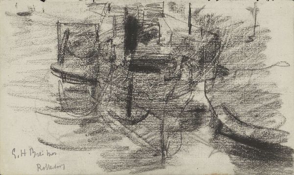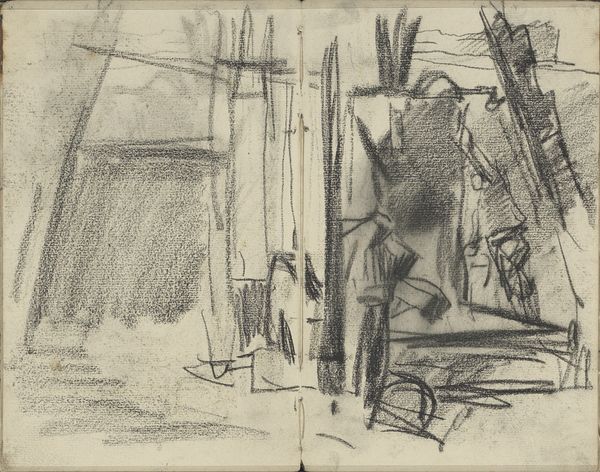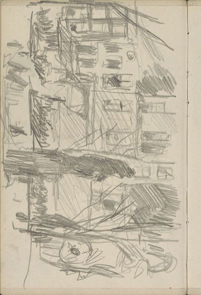 Johan Antonie de Jonge sketched "Figure Beside an Object in a Landscape" using graphite, in what appears to be the early 20th century. The drawing presents an interplay between representation and abstraction, inviting an emotional response rooted in both recognition and mystery. The scene is rendered through dense networks of lines, hatching and cross-hatching. A dark, vertical, rectangular form occupies the left foreground; next to what might be a figure stands next to it. Behind these, a more loosely defined landscape emerges, full of tree trunks and foliage. The graphite marks vary in pressure and direction, creating a texture that animates the surface. De Jonge's use of line and form does not merely depict but rather constructs a visual experience that destabilizes conventional perception. The drawing does not offer a clear narrative, instead it operates as a sign – a semiotic prompt for interpretation. The ambiguity of the subject matter allows for multiple readings, reflecting a broader modernist concern with the subjective nature of reality. This interplay between line, form, and ambiguity invites us to consider how art challenges fixed meanings.