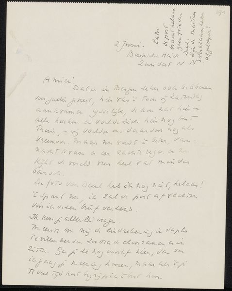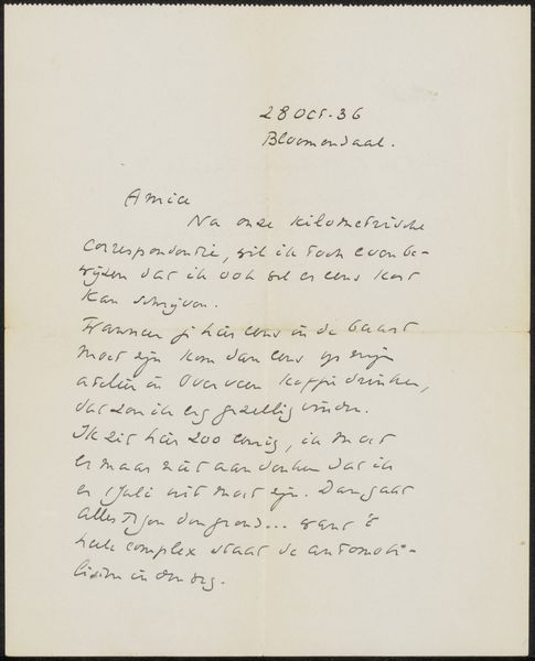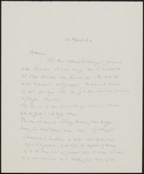Curator: Here we have "Brief aan Willem Bogtman," a letter by Richard Nicolaüs Roland Holst, likely dating from around 1934. It’s rendered in ink on paper. Editor: The first thing that strikes me is its intimacy. It feels so personal, seeing the artist's own handwriting filling almost the entire sheet. It gives off this sense of direct access to his thoughts. Curator: Precisely! The monochrome presentation really enhances the feeling of peering into the past, doesn’t it? There's an undeniable immediacy offered by something rendered by hand. It invites contemplation of not only the artist's intention but also the craft involved in its creation. Editor: It makes you think about the actual labor. The repetitive movements to form these precise strokes and letterforms across an entire page is something you can really meditate on. How do the materials influence the final image and expression? How long did it take him? Curator: Absolutely, and that haptic quality connects us to the era's material conditions as well as their expressive conventions. Look closer, and the handwriting itself bears its own weight. Notice its slant and flow and rhythm, suggesting an almost meditative or devotional state. There's also that visual, almost gestural, component created with pen and ink in stark contrast with the page. It recalls images of a monk meticulously illuminating manuscripts. Editor: And the very idea of a letter as a physical object also seems worth considering. A carefully considered document meant to traverse time and space in a material fashion, it carries so much different weight than our current digital forms of correspondence. Curator: Indeed. Holst often imbued his pieces with hidden meaning through subtle choices of visual vocabulary. These private forms become carriers for something transcendent. Editor: This act becomes something truly special, with the materials themselves giving voice to social structures and histories beyond their inherent visual character. It makes you contemplate their life cycles too. Curator: I couldn’t agree more. These personal marks become evidence that there is so much meaning within such a delicate form. Editor: In looking at this artwork, I'm left pondering the relationship between intimacy and artistic creation. It really draws you in.