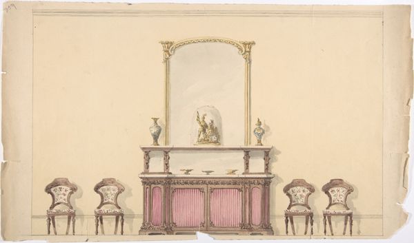 Curator: Look at this beautiful design for a breakfront, created around 1900 by Karel Vitezslav Masek. I see watercolor and drawing techniques listed, and what a blend it is of geometric forms and organic Art Nouveau swirls. Editor: It gives me such a sense of domestic serenity. The colors are so muted and gentle, it feels like peering into a dream of a very elegant pantry. Curator: Exactly! It speaks to the turn-of-the-century aspirations for beauty in everyday life. You have that cherubic figure watching over the shelves...it almost elevates the objects inside. How do you read this design in the context of its time? Editor: Considering this was the height of Art Nouveau, it reflects a move away from industrial aesthetics and toward handcrafted, nature-inspired forms. But also, we see a real attempt at social elevation through design, attempting to democratize luxury to a degree, no? Curator: Absolutely. And the symbolism of the natural world...those abstracted floral patterns inlaid on the cabinet doors…it wasn't just decoration, it was meant to instill a sense of harmony and growth. Do you find that it succeeds? Editor: I find it a fascinating tension, to be sure. On the one hand, we have nature, represented in this rather stylized form, but on the other, we have an incredibly rigid structure that reminds me of bourgeoise tastes and display. But how can the designer reconcile all these contradictions in practice? Curator: You’re right, that tension makes the piece richer. Perhaps it reflects the complexities of the era, torn between the promise of progress and a longing for an idealized past. For me, though, the charm of it lies in its quiet optimism... its belief in the transformative power of beauty in the home. Editor: For me, it's a potent reminder of the social and economic forces always present in even the most seemingly innocuous design. It’s about who gets access to beauty, to this crafted serenity you describe so aptly. Curator: Well, that's a compelling perspective. Thanks for that view. It makes me see it in a completely new light. Editor: Thanks—your focus on the piece's emotive power adds another important layer.