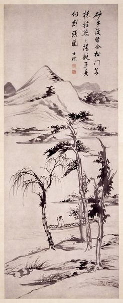 Dong Qichang rendered this hanging scroll titled "Autumn Mountains" in ink on paper sometime during the late Ming Dynasty. Dong was a towering figure in the Chinese literati, a painter, calligrapher, and art theorist who helped to define the direction of Chinese landscape painting. As a member of the elite class, Dong's work reflects the values and aesthetics of the literati. The painting is not just a representation of nature, but a reflection of the artist's inner state and cultural ideals. Note the monochrome ink and the seemingly spontaneous brushwork, these elements point to the artist's cultivated sensibility and learned skill, in addition to the inscriptions of poetry and the seals of collectors which contribute to the painting's cultural and historical narrative. Dong's landscape evokes a sense of serene detachment, a retreat from the mundane world into a realm of scholarly contemplation. It invites us to consider the complex interplay between art, identity, and social status in Ming China. The work presents a harmonious relationship between humanity and nature, while quietly reinforcing the cultural and intellectual values of its time.