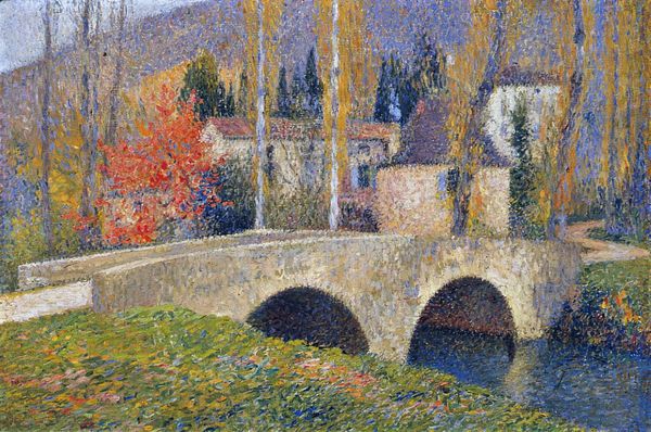 Curator: Editor: Here we have a landscape by Henri Martin, likely titled “L’eglise De Labastide-Du-Vert”, and appears to be rendered in oil paint with an impasto technique. The brushstrokes create this shimmering surface… it feels almost dreamlike. What catches your eye? Curator: The materiality, definitely. Consider the labor involved in the plein-air method, juxtaposed against the social and religious constructs inherent in the church depicted. How does the act of painting outdoors, directly engaging with the landscape, influence the finished product? Editor: That's interesting… I hadn't thought about it in terms of labor. Does the fact that it was painted on site influence the… truthfulness, maybe, of the landscape we see? Curator: "Truthfulness" is a loaded term. Instead, consider how the artist's physical engagement with the environment—the sun, the air, the sheer labor—impacts the representation. Does it elevate the ‘craft’ of landscape painting, typically viewed as "lesser," to a level more akin to "high art" precisely because of the intensity of production? Editor: So, it's the artist's direct experience and labor that almost sanctifies the process, imbuing it with more significance? I suppose if he made it entirely from memory, the location's "presence" would be lost. Curator: Precisely! The materials, the location, the weather, all play a critical role. Consider the tension: the artist working to represent a symbol of social order – the church– amidst a landscape marked by its own geological timescale and physical properties. Editor: This way of looking at it provides a totally fresh way of considering a painting. I appreciate this new perspective so much. Thank you. Curator: Likewise. I am glad that the ways and means that art emerges now seem like part of what the art truly *is.*