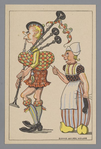 Curator: This vibrant print, titled "Picture Post Card," was created by Sikko van der Woude in 1945. The piece seems to capture a moment of jubilation following the liberation of Holland. What are your first impressions? Editor: The composition immediately strikes me as playful, almost childish. The slightly off-kilter perspective and bold, cartoonish figures suggest a simplified, perhaps idealized, representation of postwar Dutch identity. There’s an exuberance conveyed, but also a disquieting sense of forced joy given the historical context. Curator: Note how the artist uses symbolic visual markers. The accordion player is wearing traditional Dutch garb; the windmill and flags of allied forces function as signifiers of Dutch history and the end of occupation. What formal choices were made in the printmaking? Editor: Precisely. The stark outlines and flat planes of color, common in printmaking, are strategically deployed, evoking popular forms of folk art that promoted the image of a newly-liberated nation in alignment with its liberators. However, those rigid compositional constraints contribute to the stiffness in posture of the main character; a disconnect that belies the artist's stated cheer. Curator: I find that fascinating. Looking at the work, the artist's formal choices amplify this feeling of optimism. Van der Woude does use strong colors, and clearly defines space, giving a clear visual organization. The choice of media - a reproduced postcard - promotes accessibility. Editor: True, though I’d counter that its propagandistic aims arguably dilute its artistic integrity; The medium of print as a disseminator of popular ideas needs to be considered critically alongside the end goals that the work serves. Curator: An intriguing insight. So, while the formal qualities might underscore a collective moment of celebration and accessibility through prints, the underlying social context complicates our reading of this artwork. Editor: Absolutely. It compels us to question who this “cheer” is actually for, and whose voices remain unheard in this ostensibly joyful representation of “Liberated Holland.” Curator: Food for thought, indeed. It highlights how closely form and context are intertwined in shaping our understanding of art and history.