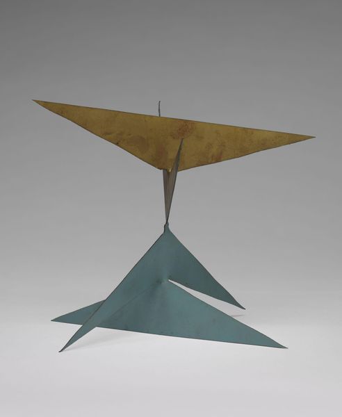 Curator: Hannes Beckmann's "Construction in Sheet Metal," presents an intriguing study of form. Its small size makes it deceptively simple. Editor: It gives me a sense of fragility, like a house of cards moments before collapse. Curator: The stark geometry brings to mind the Bauhaus, where Beckmann taught. It embodies a desire for functional beauty, a new social order through design. How might this aspiration reflect the interwar anxieties of its time? Editor: I'm more interested in how sheet metal, a humble material, is elevated here. The labor involved in shaping it, the industrial process… Curator: Yes, but consider the symbolism! The triangles, stable yet sharp, perhaps representing the tensions between progress and danger. Editor: Perhaps. Or, maybe, it’s a pure celebration of material potential and industrial craft, something to appreciate in its own right. Curator: Ultimately, it reveals the intersection of artistic intention and socio-political context. Editor: And the constant negotiation between material and meaning.