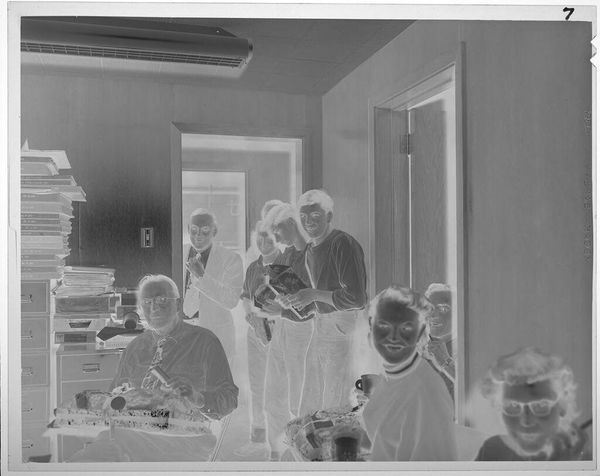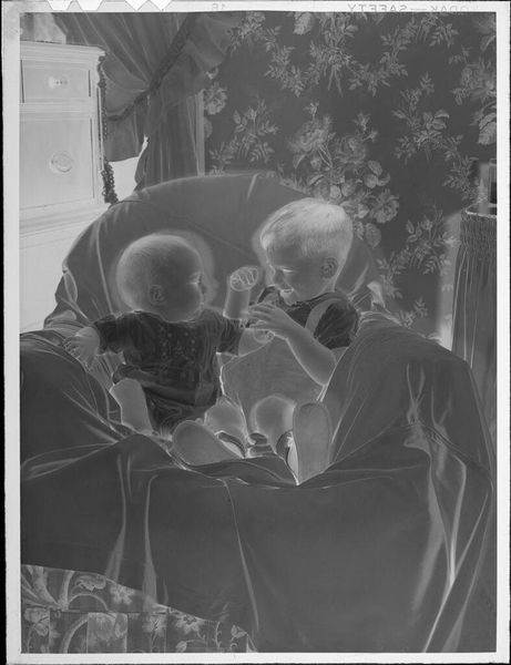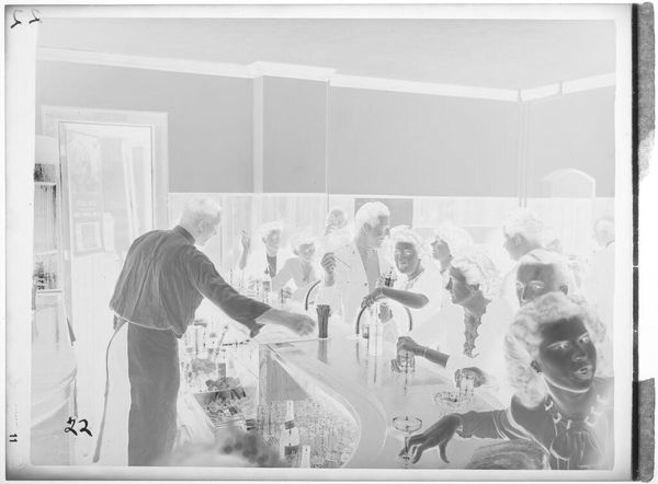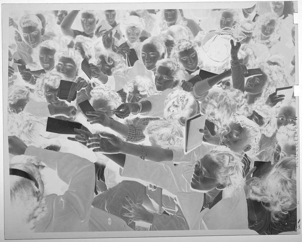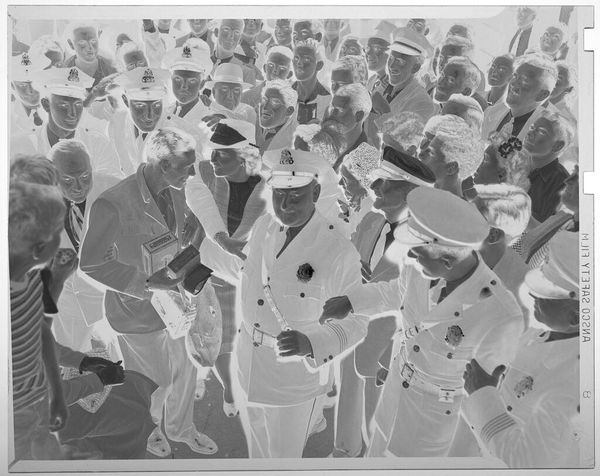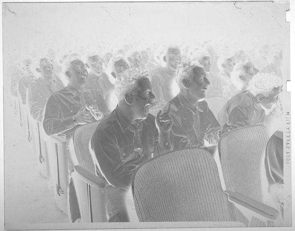 Curator: This photographic print by Jack Gould captures a theater audience of uniformed men. I'm immediately struck by the inversion of light—it lends the scene an ethereal, almost ghostly quality. Editor: It's a curious image, isn't it? The men in uniform, presumably part of some naval program, are framed within the larger theater apparatus. It speaks to the institutional labor of image-making in wartime. Curator: Absolutely. And consider the composition—rows upon rows of similar figures, yet each face subtly distinct. The individual lost in the collective experience. Editor: Precisely. The mass production of both men and images, and the interchangeability that implies within these larger systems. How easily are both consumed and disposed of? Curator: You've given me a lot to reflect on; I see this work differently now. Editor: Indeed. Hopefully we all do.