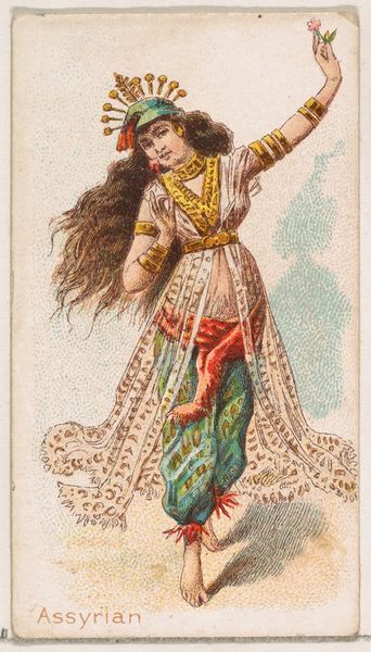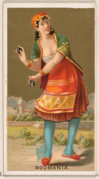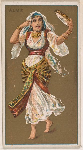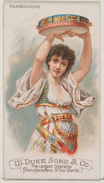 Curator: The dynamism in this piece is captivating; the way the artist has depicted movement with such simple means. Editor: I see you're immediately drawn to the composition. For our listeners, this is "Castanets," a print from 1888. It was part of the "Musical Instruments" series (N82) by W. Duke, Sons & Co. for their cigarette brand. Curator: The cigarette card aspect is revealing. It speaks to the commodification of art, even exoticized cultural performances, to fuel consumption in industrial society. Think about the mass production required, the workers involved... Editor: A sharp contrast between the romantic image and the means of its creation. Look closely at the woman's pose, her gaze; notice how her hands holding the castanets frame her face? The artist masterfully guides the viewer's eye. The application of color to suggest depth creates a delightful sense of illusion. Curator: And illusion it is. Orientalism was rampant then; the packaging of these stereotypes. The actual lived experiences of people of colour is sidelined for this spectacle, driving the profits of tobacco empires like Duke’s. It’s unsettling to realize what labor underpins these fleeting images. Editor: Certainly. However, the formal techniques are significant. Consider how the artist uses color to create a sense of depth and visual hierarchy. The reds and golds in the clothing draw us in. This combined with the softness in the veil contrasts with her harder bracelets and jewelry that create texture and an almost palpable sensory experience. Curator: Yes, even within a medium so heavily tied to commerce and exploitation, the visual construction has its own agency. Editor: Precisely. This miniature tableau is simultaneously beautiful and unsettling once one takes it at face value, a lens reflecting a broader cultural phenomenon of its time. Curator: Indeed. A valuable and succinct glimpse into a fraught historical intersection, presented as alluring entertainment, of which many like this are reminders.