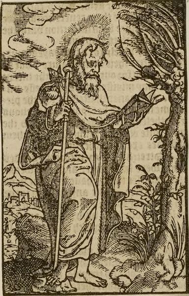 Curator: Lucas Cranach the Elder created this woodcut, "Saint James the Less." It is now part of the collection at the Harvard Art Museums. Editor: The stark black lines against the cream background create such a striking contrast! There's a sense of devout purpose, but also something playfully surreal. Curator: Absolutely. Cranach, working in Wittenberg, was deeply involved in the Reformation, and this piece reflects the era's shifting religious landscape and the role of saints within it. Editor: Notice how the lines vary in thickness, giving depth to the figure. The drapery folds are incredibly detailed, almost sculptural. And what's the meaning behind those two cherubs? Curator: Those cherubs and the setting with a distant city are part of the symbolism associated with Saint James. Cranach was commissioned by wealthy patrons and the church. Editor: Regardless of its purpose, it's a masterclass in the art of the woodcut. The composition, the figure, the landscape—it's all so brilliantly intertwined. Curator: Indeed. It shows how artistic expression can convey complex ideas during times of religious and social change.