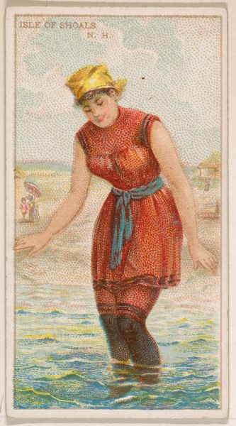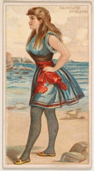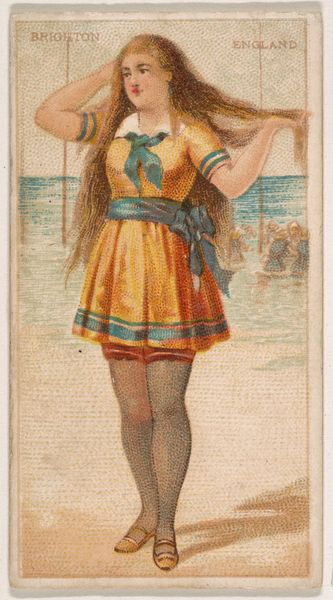Curator: This is "Deal Beach, New Jersey, from the Surf Beauties series (N232)", dating to 1889 and attributed to Kinney Bros. Tobacco Company. The piece resides here at The Met. Editor: My initial impression is one of constrained liberation. The subject, rendered in bright watercolors, is captured mid-stride, evoking movement, but the composition and medium feel decidedly posed and contained. Curator: The piece is a trading card, meant to be collected. In that light, it's interesting to think about how mass-produced imagery like this contributed to shaping ideals of femininity and leisure in the late 19th century. The subject isn't simply "at the beach"; she is an idealized type being presented and consumed. Editor: Agreed. And technically, the execution is quite interesting. The stippling creates texture, an almost pointillist effect in a photomechanical print. The high key palette and chromatic relationships add a dynamic feel which enhances the perception of depth, so it’s less a photograph than a representation of one. Curator: Considering its context, the seemingly innocent subject raises some uncomfortable questions about consumerism and representation, particularly if one thinks about race and class dynamics, or even what public “beauty” means. Editor: But there’s a definite pleasure in how light filters across her form. There’s a considered sense of placement here. Curator: Sure, the artist has carefully orchestrated how light interacts with form and fabric. But where does pleasure end, and exploitation begin, in an image like this designed for commerce? How might its message be altered through circulation and reception among different audiences? Editor: Perhaps it’s about accepting the paradoxes inherent in visual representation itself. To isolate an element for visual attention isn't necessarily reductive. There is also some compositional beauty, such as her right arm leading up towards her hair, which offers visual dynamism that complicates such direct associations. Curator: Precisely, it's not about a simple good versus bad binary, but a messy web of motivations and effects. The subject embodies this ambiguity by being both powerful and restrained, alluring and manufactured, perhaps without even knowing. Editor: Absolutely. Thanks for lending that critical framing. Curator: My pleasure. It's these dialogues across diverse theoretical vantage points that continually enrich how we engage with such artefacts from the past.