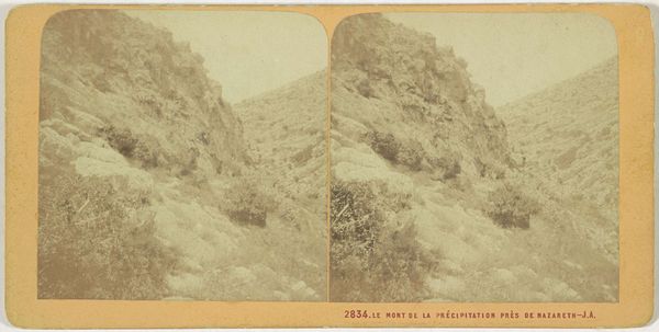 Editor: This gelatin silver print, “Schutter nabij het Sint-Jorisklooster in Wadi Qelt, Westelijke Jordaanoever,” or "Guards near the Monastery of Saint George in Wadi Qelt, West Bank," dates to 1896 and is attributed to an anonymous photographer. There's something so stark about this landscape; the solitary figure in the foreground really emphasizes the harsh environment. What do you see in this piece, beyond just the geographical details? Curator: Initially, the stark contrast between the figure and the striated rock formations grabs my attention. Note the repetitive layering—the parallel lines which serve as the dominant visual element throughout the landscape. This provides an excellent demonstration of form versus form, creating a complex geometric dance. Editor: I hadn't thought of it that way. So you are focused on how the visual elements interact? Curator: Precisely. Look at the position of the human form as placed within the frame. How does the eye move in and around it relative to the horizontal lines present throughout the space? Do we focus on it or does the repetition negate any real importance we might assign to it? Editor: It's interesting how the lines almost lead the eye *away* from the figure. The monastery almost vanishes as the textures overwhelm it. Curator: Note also that we’re missing true color, relying instead on gradation, which impacts interpretation. The tones highlight the formal qualities while simultaneously giving dimension. If color were present, would we arrive at the same conclusion? Editor: Probably not; the browns and tans flatten the perspective and emphasize texture. Thank you, this was very helpful. Curator: It has helped solidify my interpretation too, especially considering our modern assumptions about Orientalist landscape photography.