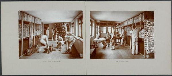 Curator: Here we have Waldemar Titzenthaler's "War: Germany. Berlin. Prussian Guard Regiment: Life in a Regiment of the Prussian Guard." Editor: The sepia tones lend it a distant, almost dreamlike quality, but the sheer number of figures hints at the machinery of war. Curator: Exactly. These images give a glimpse into the daily lives of Prussian Guard soldiers. Think about the intense social conditioning and physical labor involved. How does that shape their identities? Editor: And consider the material conditions – the shared meals, the regimented hygiene. It's a portrait of collective living, of bodies being molded by military discipline. Curator: It's a study in power, where individual expression is subsumed under the demands of the state and of war. It presents a highly gendered and militarized vision of nationhood. Editor: The photographs serve as artifacts of the industrialization of war, where even rest and personal care are systematized processes. Curator: Ultimately, these images offer a sobering reminder of the human cost embedded within grand narratives of war and nationhood. Editor: A glimpse behind the curtain of military might, revealing the repetitive labor that sustains it.