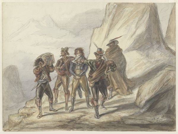 Editor: Here we have Louis Ducros' "Oponthoud bij de Grotte delle Capre aan de grens bij Nemorosa en Fredda", a watercolour from 1778 held at the Rijksmuseum. It feels almost staged, like a theatrical backdrop. The figures seem caught in a quiet moment. What do you make of it? Curator: Ah, Ducros. He had a knack for capturing the picturesque, didn't he? For me, it's that border itself – not just of land, but of styles. The rigid romanticism with those figures carefully posed against the dramatic sweep of landscape. Do you feel that slight unease of seeing people trying to scratch out a living and the artificial nature of their composition. The men look exhausted or burdened by the work as they navigate across the borders of life. Is that it? Editor: Absolutely. They do appear trapped and weary by their situation. Also the trees in the top right almost look they are hiding, blending in perfectly to protect them. Curator: And that almost monochromatic palette. Shades of grey and brown. That emphasizes this idea, doesn't it? Makes it feel austere, perhaps a bit melancholic. Not just a pretty picture postcard of rural life, more like a meditation of human resilience or perhaps something like resignation. Ducros gives us all those mixed emotions, maybe unconsciously, while still playing with the established conventions of picturesque landscape. The romantic ideal and reality clash which keeps me so intrigued with his artwork. Editor: I never would've considered the monochrome pointing to an internal emotional border instead of just a color palette. I see what you mean about the layers of contrasting themes, its amazing that these artists can convey this level of thought within a seemingly 'still' picture! Thanks for sharing. Curator: My pleasure. It’s like unlocking a secret language isn't it? Once you grasp those nuances, each artwork whispers its stories in an entirely different way.