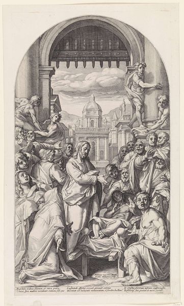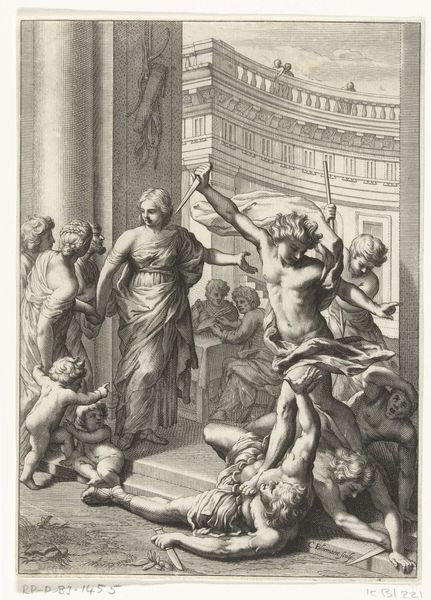 Curator: The print we are looking at is from 1670, and it's called "Onthoofding van twee koningen in opdracht van een Romeins keizer," or "The Beheading of Two Kings Ordered by a Roman Emperor" by Gerard de Lairesse, currently housed in the Rijksmuseum. Editor: It's rather striking, isn't it? The cold detachment, emphasized by the static rendering, adds a disturbing weight. The almost obsessive detail… I find myself drawn to the implied sounds—the scrape of the blade, the hushed anticipation. Curator: Absolutely. Lairesse positions this depiction of historical power and violence within a broader critique of authority. Who decides who is king, and by what justification are they disposed? What is the relationship between spectacle, violence, and governance? Editor: It’s potent symbolism, yes? The severed heads, particularly, serve as potent symbols of fallen power and injustice. The way the executioner almost seems to preen—it feels reminiscent of how classical artists portray the triumph of morality over death. Curator: But is it triumph, really? Or the cold, brutal assertion of power? Note the Roman emperor sitting impassively in the background. His detachment, rendered with meticulous precision, underscores the banality of evil. It serves as a commentary on the dangers of unchecked power within institutional frameworks. Editor: His stance, the toga, all very reminiscent of Roman imagery used through different periods to denote authority. It echoes across cultures and eras, this visual vocabulary. The visual motif has carried weight far beyond the actual Roman Empire. The upraised hand on the onlookers to the left feels like he is signaling caution or dissent in disagreement to the execution. Curator: Precisely. Lairesse’s skill lay in his ability to subtly infuse classical motifs with pointed contemporary social commentary, revealing the instability inherent within any power structure. A crucial look at not just who holds power but how it’s exerted and maintained. Editor: Thinking about the recurring depictions of decapitation in art and culture across time, this one stands out as particularly chilling. The graphic realism married to the artist's classical training evokes a deep unease. A reflection, perhaps, on our own participation in cycles of violence. Curator: Yes. A powerful testament to how history and art converge to force us to grapple with the uncomfortable truths about the past and how those patterns manifest into our present moment.