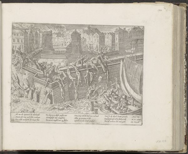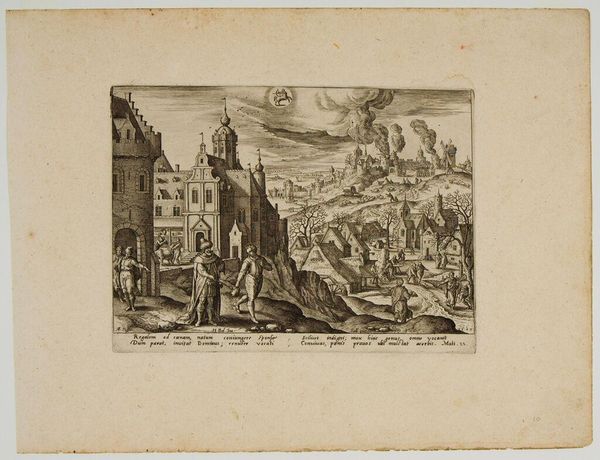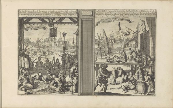 Curator: Welcome! Today, we're examining "Zonde en boete," or "Sin and Punishment," an engraving attributed to Romeyn de Hooghe, created sometime between 1682 and 1733. It's currently housed here at the Rijksmuseum. Editor: My goodness, it's… intense. Like a fever dream caught in ink. A very, very detailed fever dream. The density of figures and structures crammed into that small space is overwhelming. Curator: Indeed. It’s a dense allegory, steeped in the religious and political turmoil of its time. The cityscape is almost a stage for various acts of penitence, or perhaps what De Hooghe considered corrupt religious practice. We're seeing what could be interpreted as abuses of power alongside scenes of baptism. Editor: Baptism and flagellation! Not a combination you see every day. All these tiny figures… it's a little grotesque, if I'm honest. Like a Bosch painting on a very bad hair day. Look at the man on the left, weighed down! That elaborate carriage behind him doesn't exactly scream humility either, does it? Curator: That scene does sharply criticize indulgences, connecting earthly riches with supposed spiritual failings. The contrast is meant to highlight what De Hooghe perceived as the hypocrisy of certain religious institutions. Consider also the Abyssinian landscape; a faraway land full of sinners repenting from wrongdoing. Editor: So it's propaganda then, masquerading as… art? Though those miniature mountains have a peculiar charm. Makes me want to escape this purgatory. I mean pilgrimage! Look how tiny some of these details are! What was the poor bloke who made this using, a hummingbird feather for a brush? Curator: The skill is remarkable, absolutely. De Hooghe was a master of the engraving medium, using it here to convey very specific socio-political critiques in an era rife with religious conflict and evolving power structures. Its very small scale afforded wide dissemination and the ready circulation of controversial images. Editor: I can almost hear the righteous indignation crackling off this print. Though maybe a little subtlety would’ve made his point even more forceful. Curator: Perhaps. But sometimes the loudest voices cut through the noise. Editor: Well, it certainly has made me ponder the relationship between power, belief, and the artist’s hand… and given me the urge to wash my hands thoroughly. What about you? Curator: I am thinking about how effectively printmaking amplified critical voices like De Hooghe's in early modern Europe.