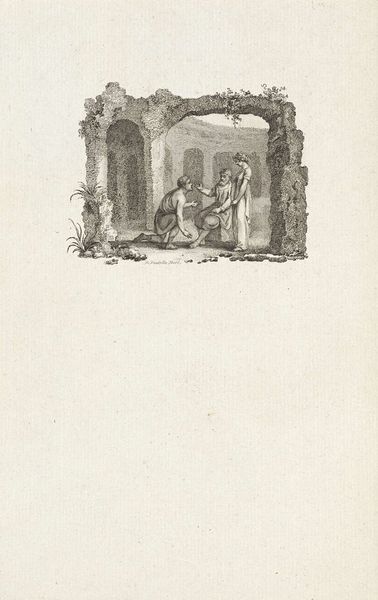 Curator: John Sell Cotman's etching, "The Manor House, York," presents a starkly beautiful ruin. What strikes you first about it? Editor: The way it feels like a stage set, a bit gothic, melancholy. That figure walking through looks almost like an actor. Curator: The etching technique—those dense, cross-hatched lines—creates a palpable sense of decay and the sublime. Note the heraldic details above the arch. Editor: Right, as if the grandeur is being overtaken. It's like time itself is another character here, erasing history. Curator: Precisely. Cotman’s composition directs our eye through that archway, suggesting narratives beyond the immediate scene. Editor: Yeah, stories whispered on the wind, I reckon. A clever piece, hinting at more than it shows. Curator: A perfect encapsulation of romantic ruin and the picturesque. Editor: Certainly, gives you a bit of a shiver, doesn't it? A good shiver, mind you.