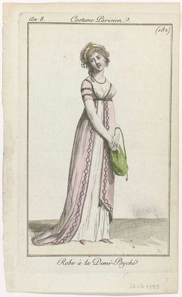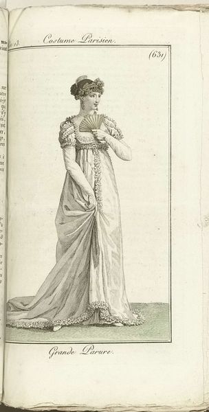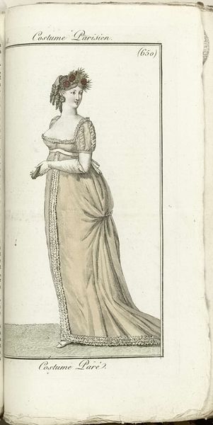 Horace Vernet made this print, “Robe et Manteau de Cour,” in France in 1805, showing a courtly fashion from the Journal des Dames et des Modes. Fashion plates were a powerful medium for circulating ideas about style and social status in the early 19th century. Publications like the Journal became key institutions in shaping taste and dictating the visual codes of elite identity. This image presents a woman in an elaborate court dress, complete with a feathered headdress and long train. The high-waisted silhouette reflects the influence of classical aesthetics on contemporary fashion, a visual trend linked to broader cultural shifts. To fully understand this print, we might look at the history of French fashion, the rise of consumer culture, and the role of the fashion press. We can then consider how the image both reflected and shaped the social norms and aspirations of its time. The visual and material culture of this time and its impact on the making of art is something worth researching.