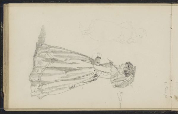 Curator: Immediately, I am struck by its fragility, almost ephemeral. Editor: That's interesting. We are looking at a pencil drawing by Willem Witsen, "Standing Woman, Possibly in Wedding Dress," dating from around 1893-1897, housed here at the Rijksmuseum. What exactly about its form strikes you so? Curator: It’s the barely-there quality of the lines, the lack of detail, the sketchiness, all point to the processes of creating art. The tentative quality speaks of experimentation; the artwork appears incomplete and more an exploration than a formal portrait. One imagines Witsen rapidly capturing a fleeting image or testing the effect of the pencil on the page. This all seems quite radical, challenging established traditions of craftsmanship and finished artwork. Editor: I see that. And it makes the figure’s monumental simplicity even more poignant, don't you think? It is precisely these subtle contrasts in texture and tone which render depth and shadow so profoundly, offering not just an illustration but insight. Look closely at how the artist plays with shading around the figure's face and form. Curator: I find it curious that you consider a pencil sketch of an unfinished portrait monumental and profound. If the figure indeed dons bridal clothing, then surely the material constraints surrounding the access to specific material during the period heavily influenced Witsen’s drawing, its themes, and its medium, even! How does the social status affect Witsen’s decisions regarding style and production? Editor: The drawing's significance to me isn't reliant on historical factors, although those are interesting; rather, the tension between delicate lines and the weighty subject conjures, for me, feelings of both hope and vulnerability. Consider too how the composition emphasizes verticality, perhaps symbolic of her aspirations. It’s truly brilliant. Curator: I am mostly intrigued by the work in light of production processes—what was omitted, included, chosen? The final output says little. I find such inquiries more useful than the traditional understanding of symbolic content. Editor: Still, it’s hard to deny the visual poignancy of Witsen’s handling of light and line. Curator: To each their own. A valuable learning experience, at least, to see it from such differing views. Editor: Indeed! It shows the capacity for even the simplest artwork to generate conversation.