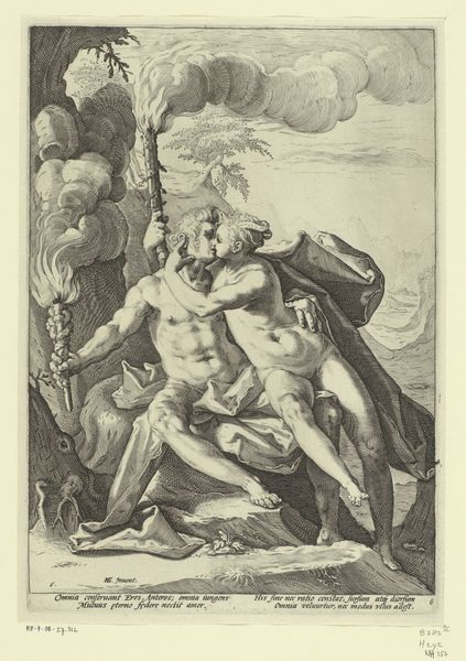 Editor: This is "Jupiter en Europa" by Jacob Matham, created between 1588 and 1592. It's an engraving on paper housed at the Rijksmuseum. The landscape feels very constructed, almost like a stage set, and the figures are so meticulously rendered. What stands out to you when you look at this print? Curator: What grabs me is the labor involved in producing such a detailed print. Think about the engraver, Matham, meticulously cutting into the metal plate. Each line, each gradation of tone represents hours of work, transforming base metal into a commodity, an image circulated and consumed. And look closer, do you see any difference in the making between landscape and figures? Editor: Well, the figures seem to have more definition and shading compared to the landscape. Why is that? Curator: Precisely. It’s hierarchy manifested in technique. The nude bodies of Jupiter and Europa, central to the mythological narrative, receive more intense labor, signifying their higher status as subjects worthy of refined craftsmanship. Whereas, look at the landscape; do you think this division reflects a separation between art and craft during that period? Editor: Yes, it does seem to elevate figure drawing and mythological subjects. Curator: Consider also who had access to such prints. Were they for a broad audience, or did their cost and availability limit them to a specific class, reinforcing existing social structures? Think of the materiality not just as ink on paper, but also as evidence of patronage, skill, and controlled distribution within the social fabric of the time. Editor: It's interesting to consider how the physical creation and distribution reflect the power dynamics of the era. Thank you for making that so clear! Curator: And thanks to you, I am remembering just how radical seemingly traditional art was made to uphold a clear power structure!