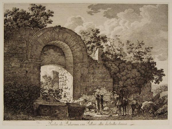 Editor: This is "Romitorio a Albano" by Jacob Wilhelm Mechau. The architectural ruins and the people in the foreground give me a sense of timelessness. How does this image fit into the artistic landscape of its time? Curator: Mechau created this print during a time when the Grand Tour was popular. It romanticizes the Italian landscape and ancient ruins, catering to the tastes of northern Europeans seeking cultural enrichment. How do you think this image contributes to the construction of Italy as a site of historical and artistic significance? Editor: It seems to reinforce Italy's image as a place of ancient beauty and cultural importance for visitors. I hadn't considered how prints like this played a part in shaping that perception. Curator: Precisely. And prints like this also helped disseminate artistic styles, influencing artists far beyond Italy's borders. Now, what does this say about the power of art and its role in society? Editor: This has broadened my view; it's more than just an image of ruins. Thanks! Curator: Indeed. Considering the social context unlocks new layers of understanding.
