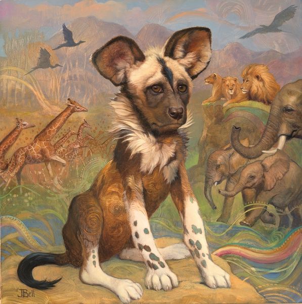 Curator: We're looking at "Duckling and the Dog" by Scott Gustafson. He’s known for creating anthropomorphic characters rooted in folklore and classic literature, and I think this piece exemplifies his approach. Editor: My first thought is the composition is brilliant; the close cropping and perspective immediately draw me in. It’s so intimate, you can practically feel the damp earth and bristly grass under the dog's muzzle. Curator: Right, and beyond the animal portraiture, consider the social dynamic represented. We have a tiny duckling confronting this much larger dog; what kind of power dynamic do you perceive? Is it confrontation or curiosity, especially since its impossible to determine an exact time when this work was made? Editor: It's definitely a confrontation, and I immediately focus on how Gustafson has used impasto techniques here with such obvious brushstrokes in the grass to achieve this. You can see he painstakingly layered to achieve dimension on a micro-level. I almost wonder how the textural quality mirrors the physical process of artistic creation. Curator: That's interesting because I see more than just textural layering. Look at the dog’s eyes and consider its gaze in the broader narrative. Is this about the history of predator-prey relations? Perhaps reflecting the more nuanced politics of co-existence and maybe an ecological statement. Editor: I agree about the nuanced ecological statements. What really hits me, however, is what kind of oil paints Gustafson may have worked with to get a more tactile sense of natural pigments and artisanal material as if to remind us where paints originate. Curator: I find it remarkable how he humanizes these animals in a seemingly natural landscape—a setting not separate from political statements but rather infused by and through it. Editor: And speaking of a tactile natural sense, the work could very well highlight class divisions and means of production within rural labor—making me question the artist's own access to high-end raw material in paints. Curator: It’s amazing to consider art reflecting historical context with materiality that also prompts us to ask critical questions about social inequality in production methods. Editor: And it underscores that art doesn't simply appear but arrives via human effort, labor, and deliberate decision-making which gives context beyond the surface.