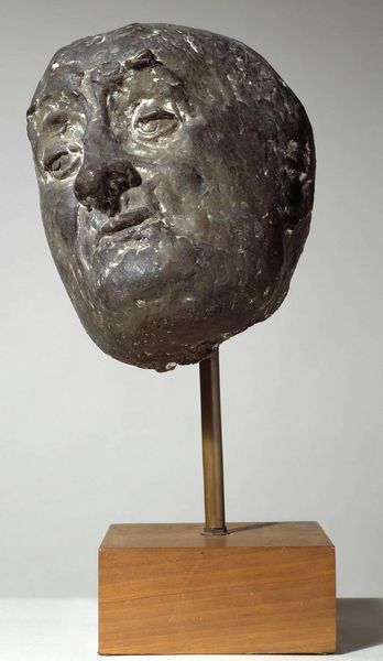 Editor: This is Sir Eduardo Paolozzi's 'Mr Cruikshank,' a bronze sculpture in the Tate collection. The smooth surface and simplified features give it a somewhat futuristic yet ancient feel. What do you make of its form? Curator: The sculpture presents a fascinating interplay of geometric forms. Note how the head is constructed from distinct planes, almost like an assemblage. This fragmentation disrupts the conventional representation of the human face. Editor: So, the planes aren't just a stylistic choice, but a way to deconstruct the human form itself? Curator: Precisely. Consider how the artist employs line and surface to create a tension between abstraction and representation. The materiality of the bronze, its color and texture, further emphasize this formal contrast. What is the overall effect? Editor: I see. The planes and the bronze, along with the simplified expression, all come together to create a sense of timelessness and dehumanization. Thank you!