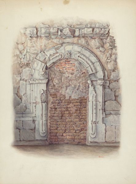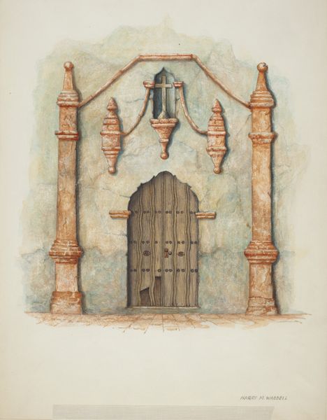 Curator: Here we have William Kieckhofel’s "Restoration Drawing: Main Doorway & Arch to Mission House," likely completed around 1939. The medium seems to be watercolor on paper, rendering an architectural scene. Editor: My first impression is a sense of warmth and stillness. The muted terracotta tones create a serene, almost dreamlike quality, focusing your attention on the architectural details. Curator: It is an interesting choice of subject. Kieckhofel worked for the Historic American Buildings Survey (HABS). It was part of the New Deal, aiming to document significant architecture during the Depression. Artists, like Kieckhofel, were employed to record these sites. It really speaks to the politics of preservation during that time. Editor: The composition definitely directs the eye. The artist's emphasis on the central arch and doorway employs classical elements. Look at the rhythmic repetition of the brickwork, which creates a visual cadence that’s quite satisfying, even calming. Curator: Indeed, it showcases an intersection of governmentality and artistic endeavor. HABS was about preserving national identity and projecting a sense of stability during tumultuous times. There was also a certain regionalist bent. Looking at structures rooted in local history allowed for an implicit promotion of American values. Editor: It's the light that fascinates me. Notice how the washes of color suggest depth and volume without heavy lines. The way the light delicately falls on the rounded arch and tiled floor provides the viewer with the image as being aged. Curator: So while you admire the use of watercolor and how it conveys light and space, I see the socio-political undercurrents shaping the artist's gaze and the selection of this specific architectural element. Editor: It is a beautiful work in both artistic intention and formal element of design and color! Curator: I agree and I'm pleased to understand more deeply how historic government programs encouraged preservation of early-American architecture.