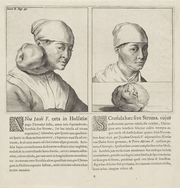 This print, made by Cornelis Visscher in 1658, captures Hendrick Hendricksz van Knollendam before and after the removal of a large tumor. In the 17th century, medical images like this played a crucial role in documenting rare conditions and surgical procedures. Hendrick's story is one that touches on identity and societal perceptions. Before the surgery, the massive growth distorts his face, drastically altering his appearance and, likely, his social interactions. One can only imagine the emotional toll of living with such a visible affliction in a time when physical appearance was so closely tied to social standing. After the operation, Hendrick’s face is noticeably different, perhaps reflecting a shift in his self-perception and how society views him. This image isn't just about medical curiosity; it's a stark portrayal of how physical health and appearance can dramatically shape an individual's identity and experience in the world.