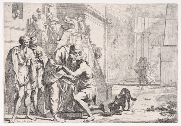 This image is a print of the ‘Beheading of Saint John the Baptist’ by an anonymous artist and is part of the Rijksmuseum collection. The composition divides the scene into distinct zones, each carefully rendered with detailed engravings. The left side focuses on the figures associated with Salome, while the right side shows the more imposing figures of the soldiers. This division highlights the power dynamics at play, contrasting feminine guile with masculine force. Light and shadow are wielded to guide our gaze, emphasizing key narrative elements such as John the Baptist's severed head. Here, the artist uses formal qualities to engage with broader themes of morality and justice. The architectural backdrop is depicted in a classical style. This element serves not only as a stage for the unfolding drama but also introduces a semiotic layer that invites interpretation. Ultimately, this print functions within a complex cultural discourse, making it more than just a depiction of a biblical event.