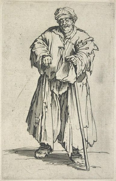 Editor: Here we have Jacques Callot's "Two Beggar Women," an etching. The detail is striking, especially given the subject matter. What can you tell us about the social context surrounding this work? Curator: Callot created this during a period of immense social upheaval. Consider the Thirty Years' War and its devastating impact. These images, distributed as prints, played a role in shaping public perceptions of poverty and the marginalized. Editor: So, it's more than just observation? Curator: Exactly. How do you think the artist’s choices of detail might influence the viewer's understanding of their plight, and perhaps, even subtly critique societal structures? Editor: I see how Callot's detailed rendering invites us to look closer at those often overlooked, prompting us to consider the social forces at play. Curator: Precisely. Art like this compels us to reflect on the relationship between representation, power, and social responsibility.