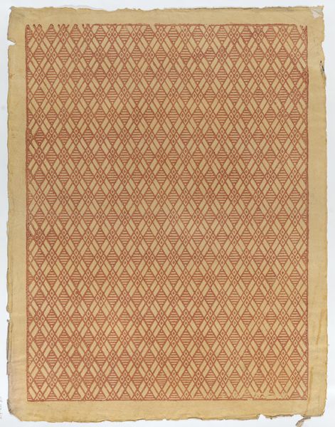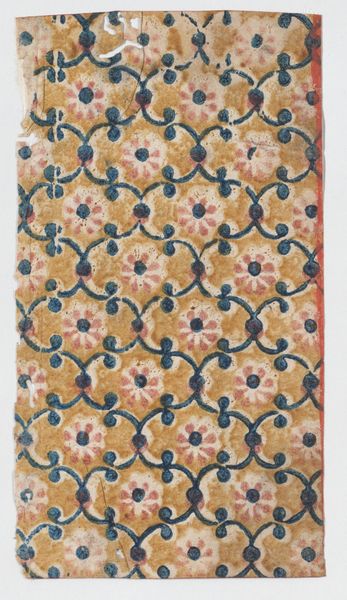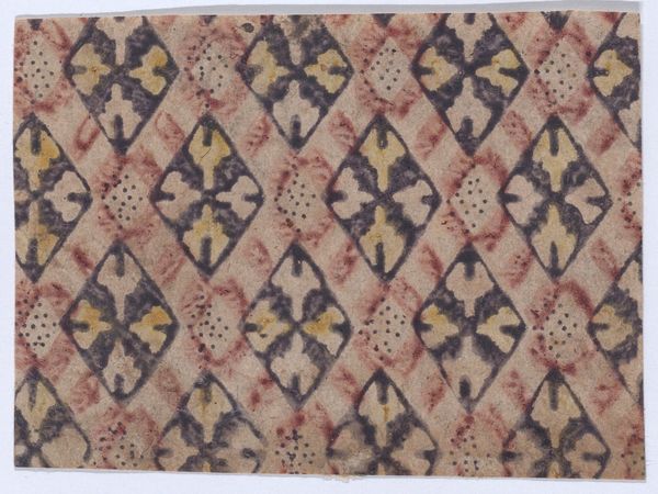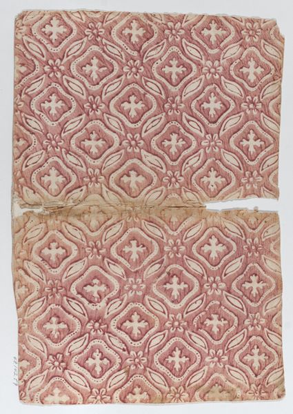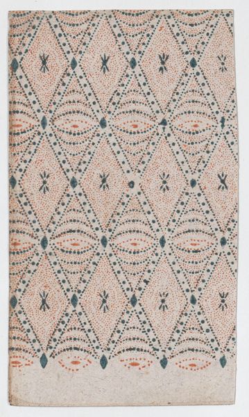 Editor: This textile design, dated between 1800 and 1900 and housed at the Met, features an overall pattern of triangles and rosettes. The repetitive nature of it is what catches my eye; it seems very precisely constructed, like a mathematical equation put onto fabric. How should we approach analyzing this anonymously created piece? Curator: The fact that this is an anonymous work produced during a time when textile production was becoming increasingly industrialized is key. Consider the labor involved in creating this intricate pattern, whether by hand-blocking or an early mechanized process. Editor: So, the means of production is the core? What sort of implications are we discussing? Curator: Precisely. Was it made by a single artisan, meticulously carving a block and applying dye, or by workers in a factory setting? The material conditions surrounding its creation are vital to understanding its meaning. How does the repetition affect your understanding of this? Does it indicate mass production? Editor: I think repetition alludes to both – a potential for hand-crafted design that’s meticulously and repeatedly deployed, or one which lends itself to more automated methods and wide scale distribution... I guess I’m pondering on consumption. If we focus on materials – dyes, fabrics used, does that tell us who could afford it? Curator: Exactly! The quality of the materials tells a story. Natural dyes? Expensive imported cotton? Or locally sourced, cheaper alternatives? These are clues about who the intended consumer was. Furthermore, think about its potential function. Was it for clothing, a household furnishing? Editor: I suppose its use also implicates other areas of manual labor – like its incorporation into clothing made by seamstresses! Looking at this piece with all the social labour attached does indeed broaden my understanding and enjoyment of the textile. Curator: And that’s exactly the point. By analyzing its production and consumption, we can gain insights into the social and economic landscape of its time. It makes us mindful of what the item went through.