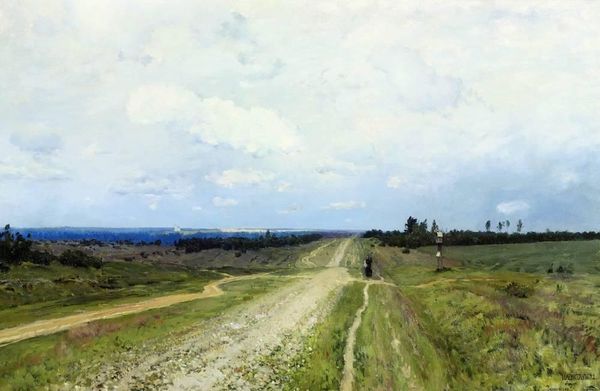 Editor: Here we have William Merritt Chase's "Shinnecock Hills," painted around 1895, using oil on canvas. I'm struck by the peaceful stillness of the landscape, and how the road draws your eye into the distance. What story do you think Chase is trying to tell with this particular landscape? Curator: That stillness, that invitation into the scene, is carefully constructed. Consider the cultural context: Chase founded the Shinnecock Summer School of Art in Long Island, one of the first outdoor art schools in America. This wasn’t just about painting; it was about democratizing art education and bringing it to a wider audience, particularly women. Editor: So the landscape itself becomes a kind of classroom? Curator: Precisely. And who had access to this "classroom?" The rising middle class, seeking leisure and self-improvement. Shinnecock Hills, in this rendering, wasn't just a place, it was an aspirational space. The composition subtly reinforces that, don't you think? Editor: In what way? Curator: Look at the open road. It’s unpaved, natural, but not wild. It suggests accessibility, manageability. The carefully placed fence posts could suggest cultivated space. The land is being gently reshaped by the presence of people, reflecting a shift in society's relationship with nature, driven by urbanization and a yearning for the rural idyll. The subtle implication of power through land use is present, too. Editor: That's fascinating; I hadn’t considered how the school and the area were so intertwined with social mobility. I thought it was simply a nice painting. Curator: Art is rarely ever *simply* anything! Even a seemingly idyllic landscape carries within it the currents of social and political history, of who is invited to participate and who isn’t. We can ask, did Chase give careful attention to Indigenous or working-class experiences in his renderings? Editor: I'll definitely be thinking about the hidden social layers in landscapes from now on. Thanks for showing me how to look beyond the surface.