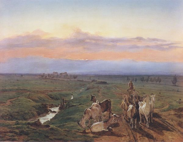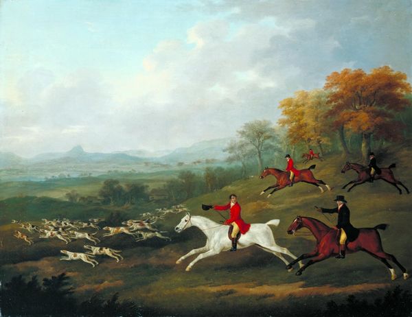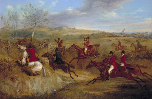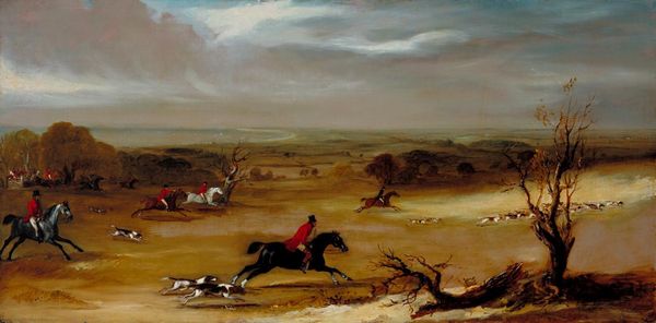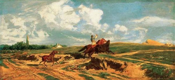 Editor: This is Albert Bierstadt’s "The Last of the Buffalo," painted in 1888 with oil on canvas. It's quite a dramatic scene; a clash between humans, horses, and the massive buffalo set against a backdrop of a vast landscape. I am struck by how the skulls littering the foreground add a very heavy, symbolic weight to the drama playing out. What stands out to you the most about this piece? Curator: The most powerful aspect is how it uses the visual vocabulary of Romanticism to stage a moment heavy with cultural loss. Notice how Bierstadt contrasts the 'sublime' mountain backdrop – representing an idealized American West – with the foreground's carnage. What do the skulls signify to you? Editor: They are clearly memento mori, stark reminders of death, and of a once vibrant ecosystem being decimated. Curator: Exactly! Bierstadt isn’t merely depicting a hunt; he's composing a visual elegy. He masterfully employs symbols – the dying buffalo, the hunter, even the pristine mountains looming in the distance – to comment on the perceived end of an era. Do you think he romanticizes the Indigenous figure? Editor: It's hard to say; it's a romantic style, so there is an element of idealization. However, by presenting him as the active force, Bierstadt complicates any simplistic interpretation of victimhood. It becomes about transition. Curator: Precisely. This painting shows a specific cultural moment laden with many intersecting memories – of a changing West, of disappearing wildlife, and of cultures clashing and transforming. It's a potent visual record. Editor: I hadn't thought about how each element functions as a symbol within a broader narrative of cultural change and loss. This adds so many new layers of understanding!