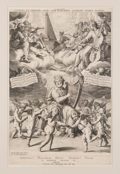 Curator: This is "Christus verschijnt aan de hemel," or "Christ Appearing in the Sky," an engraving by Gustav Adolph Müller, likely created between 1704 and 1767. Editor: My first impression is one of…organized chaos. A flurry of figures, text, and heavenly bodies, all meticulously rendered. It seems incredibly busy, and the overall feeling is a sense of anticipation. Curator: Yes, busy but controlled! It’s a print, so consider the labor involved in its creation. The precise lines of the engraving, all carefully etched to produce this detailed image—think of the skilled craftsperson behind it all, meticulously transferring a design. Editor: And speaking of design, look at the central placement of Christ, bathed in light, floating serenely above the turmoil below. It's a classic visual representation of hope and divine intervention, isn’t it? Note how every character seems to react or pray in unison! This work is less about human accomplishment, and more about how those people perceived Christ. Curator: True, there’s a tension between earthly struggles and heavenly grace. But even the concept of divine grace had very earthly consequences in that moment. Look at the composition—the weight is at the bottom, distributed more and more up to Christ as he ascend upward, floating to the viewer. It's a brilliant balancing act of visual components and theological concept. Editor: Exactly! Consider the symbolic weight of the figures, the light as a common cultural understanding of god, even the angels pointing directly at Jesus! Curator: Indeed, that's fascinating—and I see your point, examining the deeper symbolic elements. To see how earthly labor is transmuted into the expression of belief and devotion, shaped by social, political, and of course religious forces. Editor: Right, but tracing the enduring impact and presence of such imagery, we start seeing these symbolic traditions taking root, allowing us to trace history back. What do you take away most after viewing it again? Curator: I am again thinking of the materials, that a carefully handled engraving became a conveyor of these meanings. The contrast of black and white to communicate complex scenes. Editor: To me, it is always how artists embed all these cultural cues we learn by observation, helping to reinforce the ideas within those eras.