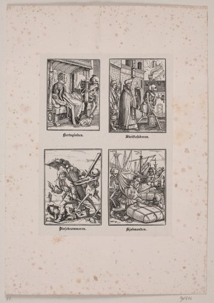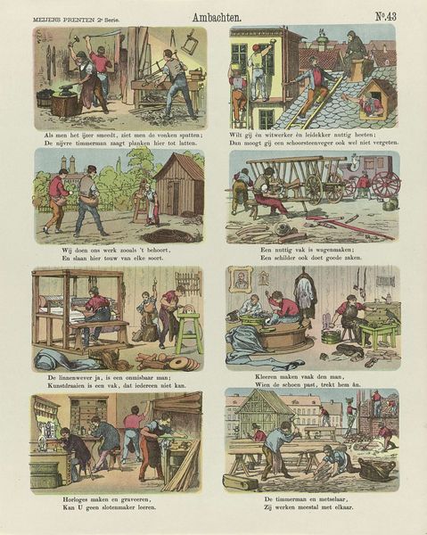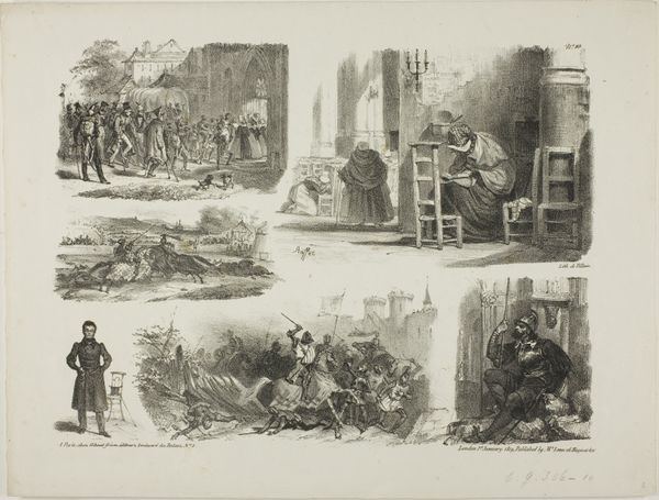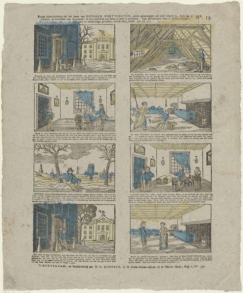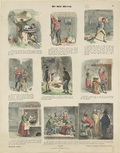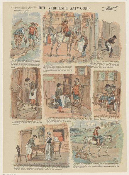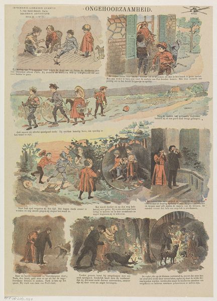 Curator: This mixed media piece by Albert Quantin, created between 1876 and 1895, is titled "Het alarmgeroep". The title translates to “The Alarm Call.” Editor: It certainly does feel like a call to action. The frantic energy leaps right off the surface. I'm struck by the arrangement of panels, like a page ripped from an adventure magazine. Curator: Precisely. Quantin used this almost comic strip style to disseminate social narratives. This piece, in particular, likely circulated as a print, intended to quickly convey a story and influence public sentiment regarding themes such as community, defence, and vigilance. The print medium makes the imagery very accessible to the public, helping inform social perception. Editor: The formal qualities also reinforce the narrative urgency. Notice how Quantin employs watercolour for a somewhat hazy effect, especially in those nighttime scenes. It almost romanticizes what otherwise appears a coarse moment of village defence. He is, moreover, pushing impressionistic strategies here for the rapid capture of these dramatic instances in time. Curator: The lack of a central focus pushes viewers to engage with the series of events collectively. One could infer this approach suggests a more communal rather than individualized sense of bravery. Editor: I agree. But even on its own terms, the dynamic diagonals in the compositions contribute a real visual tension. It avoids stasis in every corner; our eyes simply never stop moving across the surface! Curator: Considering the piece's historical setting, it prompts thinking about national identity. How were citizens urged to visualize solidarity in times of unease? This is a work very much entrenched in building political morale. Editor: Right, and beyond its propaganda value, there is simply the formal play of light and shadow, used so artfully. It’s that dramatic, staged feel—akin to theatrical lighting, adding a layer of artificiality to the scene, which, for me, only heightens its impact as an aesthetic experience. Curator: Ultimately, viewing "Het alarmgeroep" delivers an intriguing glimpse into how visual narratives shaped collective sentiments, especially during periods of social transformation and evolving print culture. Editor: And as a masterclass in the dynamics and storytelling achieved through form, Quantin offers an exemplary study in the integration of structure and drama!