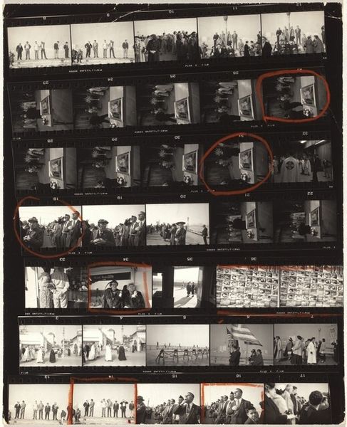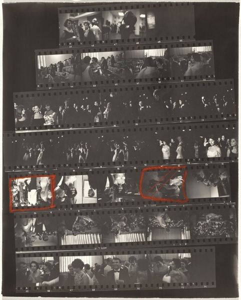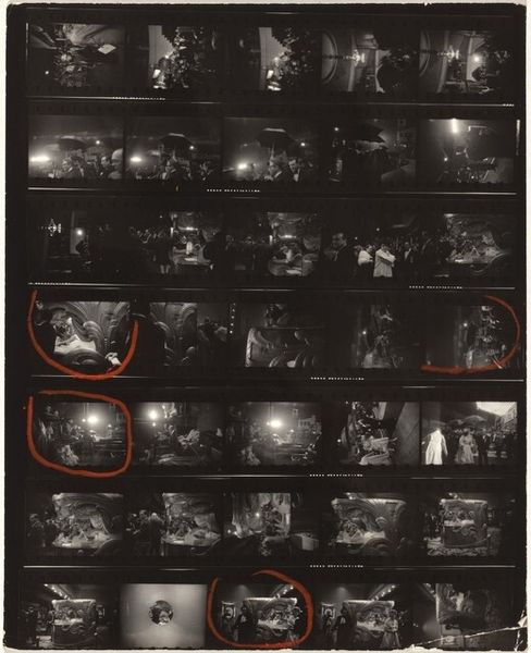 Curator: What a striking, if unconventional, contact sheet. The image we’re looking at is Robert Frank’s "Guggenheim 654—Cafeteria, San Francisco," captured around 1956. It's a gelatin silver print showcasing a series of frames. What’s your immediate take on this? Editor: Claustrophobia, immediately. The compressed frames, the black and white, it all speaks of confinement. The visual cacophony hints at repressed energy. Are these individual images meant to be representative of the people featured? Curator: Precisely! Each frame encapsulates a miniature narrative. Consider, for instance, how the use of multiple frames echoes the transient encounters and compressed experiences characteristic of city life. A symbol representing a culture shocked and rapidly changed due to the second world war and the development of more consumerist aspirations and capitalistic goals. Editor: Visually, it's fascinating how Frank challenges the conventional ideas around image composition, choosing to include the surrounding elements of the negative itself as a method for expanding the visual space beyond each specific photo and also inviting viewers to be immersed within his way of framing reality. There is little attention to formal portraiture beyond what is needed for its legibility. Curator: True, his perspective isn't formally polished but raw. I'd say it is in response to that reality, of wanting to show his audience exactly how the modern experience and lifestyle had become so increasingly accelerated and commercialized. Notice the presence of repetition, a clear sign that people find comfort within conformity in a way; but is that what people really wanted? Or were they pressured? Editor: I like how Frank leaves open to interpretation how the people themselves are experiencing modern lifestyle. And in terms of overall design and message, its aesthetic qualities and lack of pretense are powerful in the conversation. The juxtaposition of figures within these borders constructs a rich network of relationships. Curator: Agreed! This artwork is not merely about its literal subject, it explores cultural narratives embedded in the common day and how images can have multiple readings across time. I appreciate his boldness to take the "now or never" photograph, as a true visual anthropologist. Editor: Yes, Robert Frank shows that the visual and tactile language used is crucial in interpreting this art; it's in those imperfect juxtapositions that its unique appeal comes through.