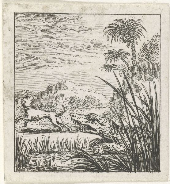 Curator: This is "Fable of the Dog and the Vulture" by Simon Fokke, created in 1769. It’s an engraving, ink and graphite drawing, part of the Rijksmuseum collection. Editor: Immediately, there's a delicate brutality to it, isn't there? The fine lines contrast sharply with the harshness of the scene—the dog seems to be protecting its meal from the descending vulture. Curator: Precisely. Fokke was working within a period where moralizing fables were a popular subject in art. This image speaks to the themes of greed and the struggle for survival prevalent during that time. We can understand that public reception would have engaged with it on a pedagogical level. Editor: The composition guides our eye masterfully. Notice the subtle play of light and shadow, achieved through varied line weight. See how the artist contrasts the detail in the foreground elements with the looser hatching suggesting atmospheric perspective. This visual technique adds depth. Curator: The engraving was likely disseminated widely through prints. Such affordable artworks brought visual narratives into middle-class homes, embedding them into public consciousness. Editor: I see a landscape in the distance – perhaps a port or city that’s reduced by the diminutive scale of the work itself. The landscape and the composition as a whole are organized in relation to one another, each serving an indispensable narrative role, no? Curator: Absolutely. And the animal allegory – quite common! – made the complex socio-economic realities accessible, shaping perceptions of avarice and justice. Editor: This work seems a fascinating example of semiotic representation where line, form, and scale work harmoniously, but it also presents a harsh lesson about power dynamics. Curator: It reminds us how images like these played an essential role in constructing social norms, beliefs, and ethics within society at the time. Editor: Indeed. Even through its modest size and refined execution, the artist successfully communicated about greed and survival.
