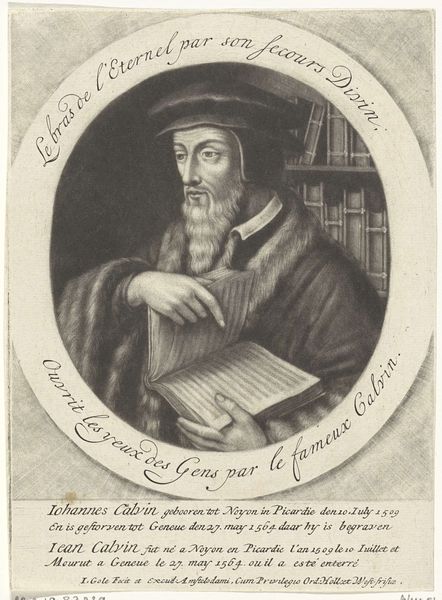 This is Pieter Schenk's portrait of Johannes Calvijn, made around the turn of the 18th century using etching and engraving. The image captures Calvijn, a key figure in the Protestant Reformation, in a moment of contemplation with a book in his hands. The choice to depict Calvijn with a book emphasizes his intellectual contributions and his focus on scripture. During the Reformation, there was a strong desire to return to the original texts, challenging existing norms and hierarchies. This portrait reflects the values of the reformation, highlighting individual interpretation and a direct relationship with the divine. Consider the cultural context: Schenk created this portrait long after Calvijn's death, during a time when religious and political identities were still deeply intertwined. The portrait then isn't merely a likeness; it’s a statement about the enduring influence and the continued relevance of Calvijn's ideas. It invites us to reflect on how religious figures shape societal structures, and how their legacies continue to resonate through art.