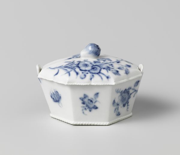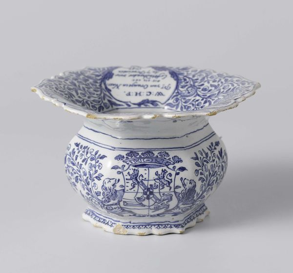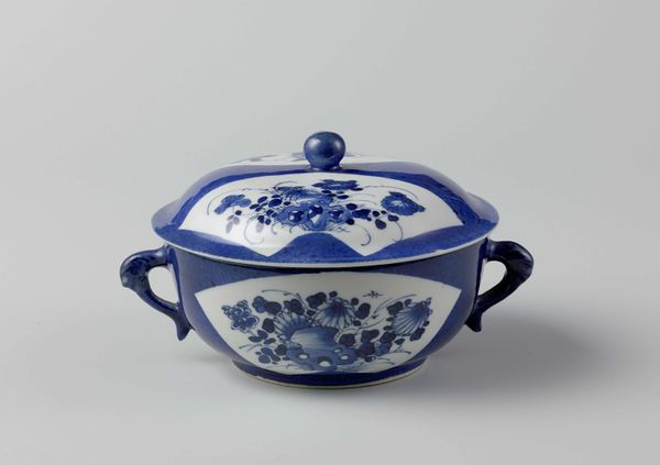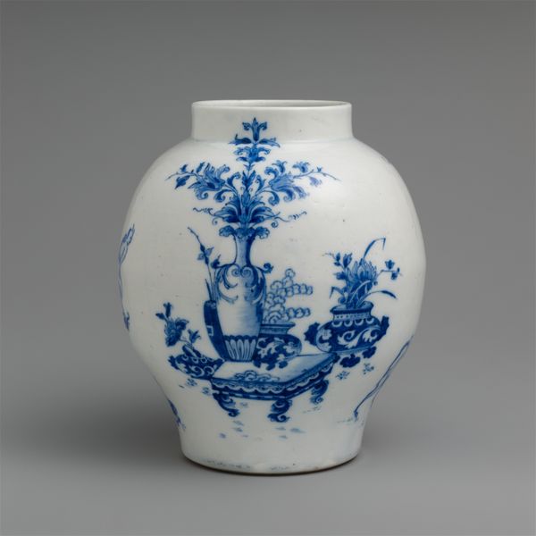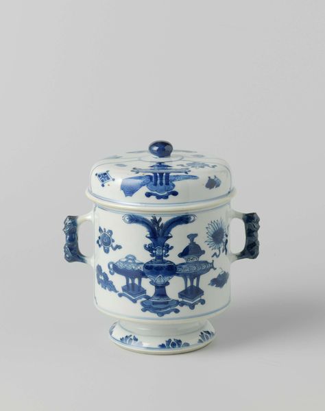 This cylindrical jar with a lid is decorated with precious objects and antiquities painted in blue on white. We see ornate vessels and stylized feathers that reflect a fascination with the exotic and precious, echoing the historical Silk Road trade. These motifs are not isolated; they resonate with similar patterns found across diverse cultures and epochs. The feather, for instance, a symbol of status and divine connection, appears in ancient Egyptian headdresses, indigenous American art, and Renaissance courtly fashion. Its presence on this jar evokes a collective memory of opulence, prestige, and power. The symbolic arrangement may also tap into a deeper, subconscious desire for material wealth. It’s as if this jar becomes an embodiment of accumulated knowledge, history, and aspiration. Note how this assemblage of objects is not random but is a deliberate construction. The non-linear, cyclical progression of these symbols resurfaces here, evolved, and taken on new meanings in a unique context.