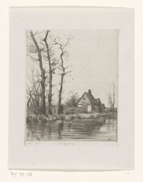 Curator: We’re now looking at "Poortershuis aan het Damsterdiep in Groningen," an etching dating from between 1883 and 1925, created by Waalko Jans Dingemans. Editor: It has an almost mournful stillness to it. The muted tones create a sense of hushed solitude around the building reflected in the water. Curator: The image shows a house built directly on the water of the Damsterdiep canal. The style evokes Dutch Golden Age paintings, particularly in its attention to detail and the realistic rendering of light. The print offers a valuable glimpse into urban life of the late 19th and early 20th centuries. The lack of figures—except for those two barely visible in the distance—creates a certain feeling. Editor: Yes, a deliberate feeling of disconnect. Water, as a recurring symbol, might reflect shifting realities and social currents. Considering this was done during a time of great social upheaval and growing industrialization, it hints at the potential displacement and alienation people experienced as they moved away from traditional life into the city. The building’s sturdy form might also symbolize resistance and historical weight, as cities began changing rapidly. Curator: I see that too. It speaks to broader conversations around preserving cultural heritage amid ongoing change. Dingemans subtly connects the architectural landscape with societal transformation. Perhaps these are houses occupied primarily by men, connected with waterways where much commerce was completed, a potential economic and power structure being alluded to in the work. Editor: Fascinating. The reflections are intriguing. What does it mean when the foundations of a place, literal or metaphorical, seem to be swallowed by the passage of time? The clouds above, while gentle, still carry a sense of passing, as everything is transient. It feels like a melancholic but powerful meditation on time, change, and enduring architecture. Curator: Absolutely, and by examining the city itself and those structures which carry a kind of memory, it really does evoke a sense of how identities form, too. This seemingly straightforward depiction reveals itself to be something much more complicated than initially seen. Editor: Yes, Dingemans gifts us an enduring set of reflections.