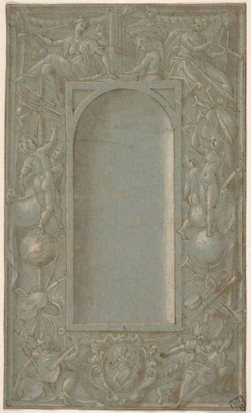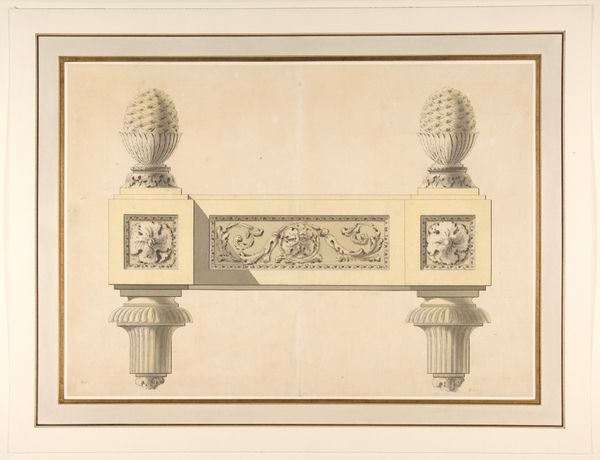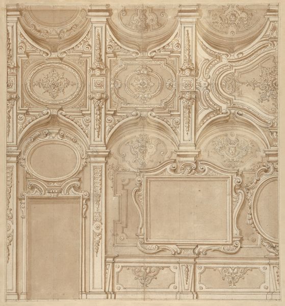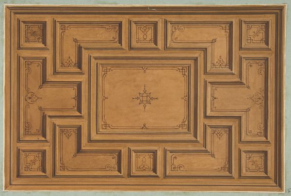 Jules-Edmond-Charles Lachaise created this watercolor work called, "Elevation of an interior showing a wall decorated in ornate panels and mounted statuettes." The artwork presents a symmetrical arrangement of three ornate panels, each defined by curvilinear forms highlighted in gold against a muted background. The gilded details pop, drawing the eye across the surface. The symmetrical structure suggests a study in historical aesthetics, but also a deeper exploration of structure and form. Each panel acts as a visual signifier, the cartouches suggesting symbolic meaning. The artwork engages with semiotic theory by employing visual elements to signify status and sophistication. The carefully balanced composition destabilizes any singular interpretation. The ornate design and balanced symmetry prompt us to consider how the interplay of color, shape, and decorative elements challenges fixed notions of beauty and order. This watercolor offers a rich site for ongoing interpretation and contemplation of cultural and philosophical ideas.