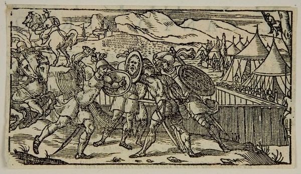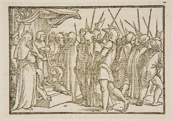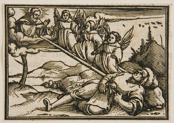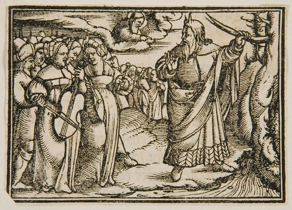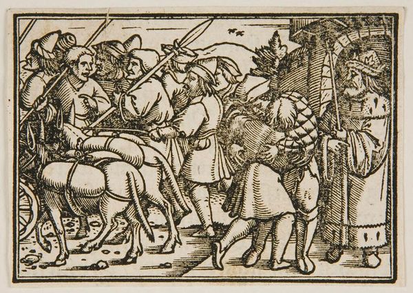Curator: This small, anonymous woodcut, "Lot and His Family Leave Sodom," depicts a pivotal moment of destruction and escape. The artwork, housed here at the Harvard Art Museums, captures the biblical narrative with striking visual economy. Editor: Gosh, what a bleak little scene! The heavy lines and stark contrasts create such a sense of urgency and impending doom, don't they? It's like looking into a nightmare. Curator: Absolutely. The piece reflects the religious and social anxieties of its time, likely the 16th century, where interpretations of sin and divine punishment were prominent. We see Lot's wife, turned to a pillar of salt for disobeying God’s command not to look back, as a cautionary figure. Editor: She's… kind of adorable, that pillar. But yes, the composition really does hammer home the terror; everyone is fleeing, angels are brandishing swords, the city burns… And yet, there's that little group tucked away in the top right that seems rather unbothered by the calamity. Curator: Indeed, their seeming indifference highlights the complex moral landscape the artwork evokes. We're left to contemplate the nature of obedience, faith, and the consequences of societal corruption. Editor: I find it funny that despite the doom, despite the moral lessons, this feels weirdly… human. Imperfect. Makes you wonder what they were all really thinking. Curator: Precisely; it's in those ambiguities that the artwork continues to resonate. Editor: Makes you wonder if anyone deserves to be turned into salt, you know?